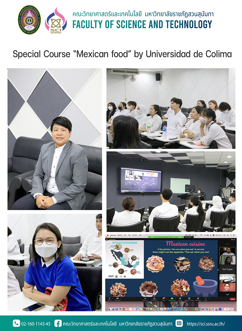 วันที่ 11 ตุลาคม 2566 เวลา 08.30 น. ฝ่ายบริการการศึกษา คณะวิทยาศาสตร์และเทคโนโลยีร่วมกับสำนักศิลปะและวัฒนธรรม มหาวิทยาลัยราชภัฏสวนสุนันทา และ Universidad de Colima สหรัฐเม็กซิโก จัดคอร์สบรรยายพิเศษให้กับนักศึกษาสาขาวิชาคหกรรมศาสตร์ ชั้นปีที่ 2 คณะวิทยาศาสตร์และเทคโนโลยี เรื่อง อาหารเม็กซิกัน โดย Professor Ruth Jael Sugias Elizalde, Chef Jesús Solis Marin and Professor Nuchnudee Chaisatit ร่วมกันบรรยายในหัวข้อ Introduction to Mexican context, Mexican identity, Food as a part of identity การบรรยายในครั้งนี้ ทำให้นักศึกษาได้รู้ถึงวัฒนธรรมต่างๆ ของสหรัฐเม็กซิโก โดยเฉพาะอย่างยิ่งวัฒนธรรมทางด้านอาหาร ซึ่งนักศึกษาสามารถจะได้นำไปประยุกต์ใช้ในการเรียนตลอดจนการทำงานต่อไป