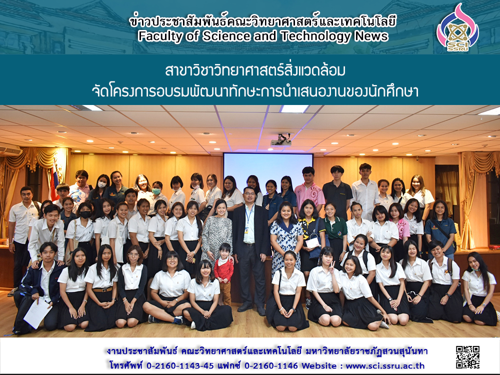 เมื่อวันพฤหัสบดีที่ 30 มกราคม 2563 สาขาวิชาวิทยาศาสตร์สิ่งแวดล้อม คณะวิทยาศาสตร์และเทคโนโลยี มหาวิทยาลัยราชภัฏสวนสุนันทา ได้จัดโครงการอบรมพัฒนาทักษะการนำเสนองานของนักศึกษา เช่น การนำเสนอผลงานวิจัย การนำเสนองานสัมมนา หรือการนำเสนองานในที่ประชุมต่าง ๆ ทั้งนี้ ได้รับเกียรติจาก ดร.วิชญา รงค์สยามานนท์ อาจารย์ประจำคณะสิ่งแวดล้อมและทรัพยากรศาสตร์ มหาวิทยาลัยมหิดล มาบรรยายให้ความรู้ถึงเทคนิคในการเตรียมสื่อและการนำเสนองานต่าง ๆ โดยมีนักศึกษาของสาขาวิชาวิทยาศาสตร์สิ่งแวดล้อมในระดับชั้นปีที่ 3 และ 4 จำนวน 94 คน เข้าร่วมในการอบรม