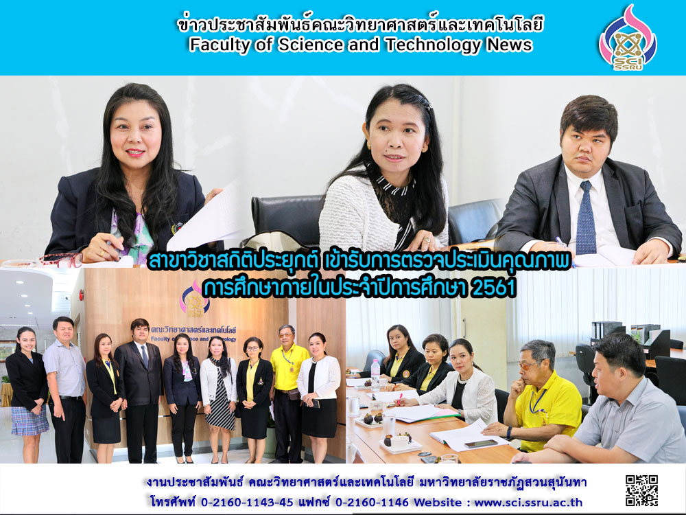 วันที่ 12 กรกฎาคม 2562 หลักสูตรวิทยาศาสตรบัณฑิต สาขาวิชาสถิติประยุกต์ เข้ารับการตรวจประเมินคุณภาพการศึกษาภายใน ประจำปีการศึกษา 2561 โดยได้รับเกียรติจากผู้ทรงคุณวุฒิจากภายนอก จำนวน 3 ท่าน ได้แก่ ผศ.ดร.อัญชลี ทองกำเหนิด (ประธานกรรมการ) อาจารย์สมสมัย เจริญสุข (กรรมการ) อาจารย์ชม ปานตา (กรรมการ) และ นางสาวเมลานี อุระสนิท (เลขานุการ) ทั้งนี้ เพื่อเป็นการประเมินผลการดำเนินงานของหลักสูตรตามรอบปีการศึกษา 2561 และนำผลการประเมินที่ได้มาพัฒนาหลักสูตรสาขาวิชาต่อไป
