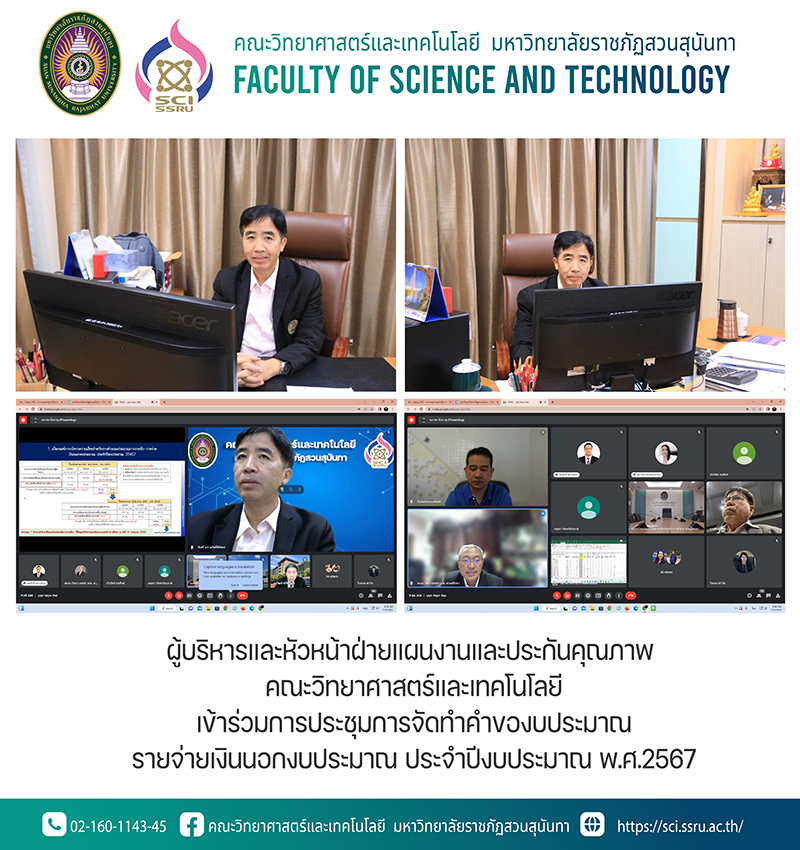 วันที่ 12 กรกฎาคม 2566 คณะวิทยาศาสตร์และเทคโนโลยี นำโดย รองศาสตราจารย์ ดร.ชัยศรี ธาราสวัสดิ์พิพัฒน์ คณบดีคณะวิทยาศาสตร์ฯ ผู้ช่วยศาสตราจารย์ ดร.ชินวัฒน์ ศาสนนันทน์ รองคณบดีฝ่ายแผนงานและประกันคุณภาพ และนายศุภกิจ ขจรกิตติมศักดิ์ รักษาการหัวหน้าฝ่ายแผนงานและประกันคุณภาพ เข้าร่วมการประชุมการจัดทำคำของบประมาณรายจ่ายเงินนอกงบประมาณ ประจำปีงบประมาณ พ.ศ.2567 โดยมี รองศาสตราจารย์ ดร.วิทยา เมฆขำ รองอธิการบดีฝ่ายแผนงานและประกันคุณภาพ เป็นประธานการประชุม ผ่านระบบออนไลน์ Google meet