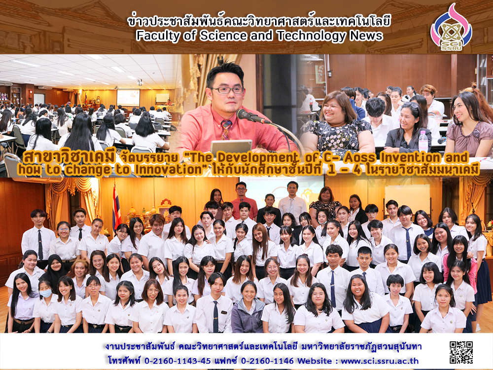 วันที่ 11 กันยายน 2562 ณ ห้องประชุม 26103 สาขาวิชาเคมีคณะวิทยาศาสตร์และเทคโนโลยี มหาวิทยาลัยราชภัฏสวนสุนันทา จัดการบรรยายในหัวข้อ "The Development of C- Aoss Invention and how to change to Innovation" โดยได้รับเกียรติจาก อ.ธนวรรธน์ สัตตบงกช นักวิจัยผู้พัฒนานวัตกรรม C- Aoss ไม้โกงกางเทียมเพื่อป้องกันการกัดเซาะชายฝั่งและรากไม้เทียมเพื่อเร่งการตกตะกอน จาก บริษัท อาร์โต้ เอ็นจิเนียร์ จำกัด และ อ.สิงหา เขียวดี จาก บริษัท จ้าวปฐพี การเกษตร (ประเทศไทย) มาบรรยายให้ความรู้แก่นักศึกษาสาขาวิชาเคมี ชั้นปีที่1 - 4 จำนวน 76 คน ซึ่งการบรรยายนี้เป็นส่วนหนึ่งของรายวิชาสัมมนาเคมี ทั้งนี้เพื่อเป็นการส่งเสริมให้นักศึกษาได้เรียนรู้จากประสบการณ์โดยตรงของนักวิจัย เพื่อให้นักศึกษาสามารถนำความรู้ที่ได้ไปใช้พัฒนาตนเองจากรายวิชาดังกล่าว