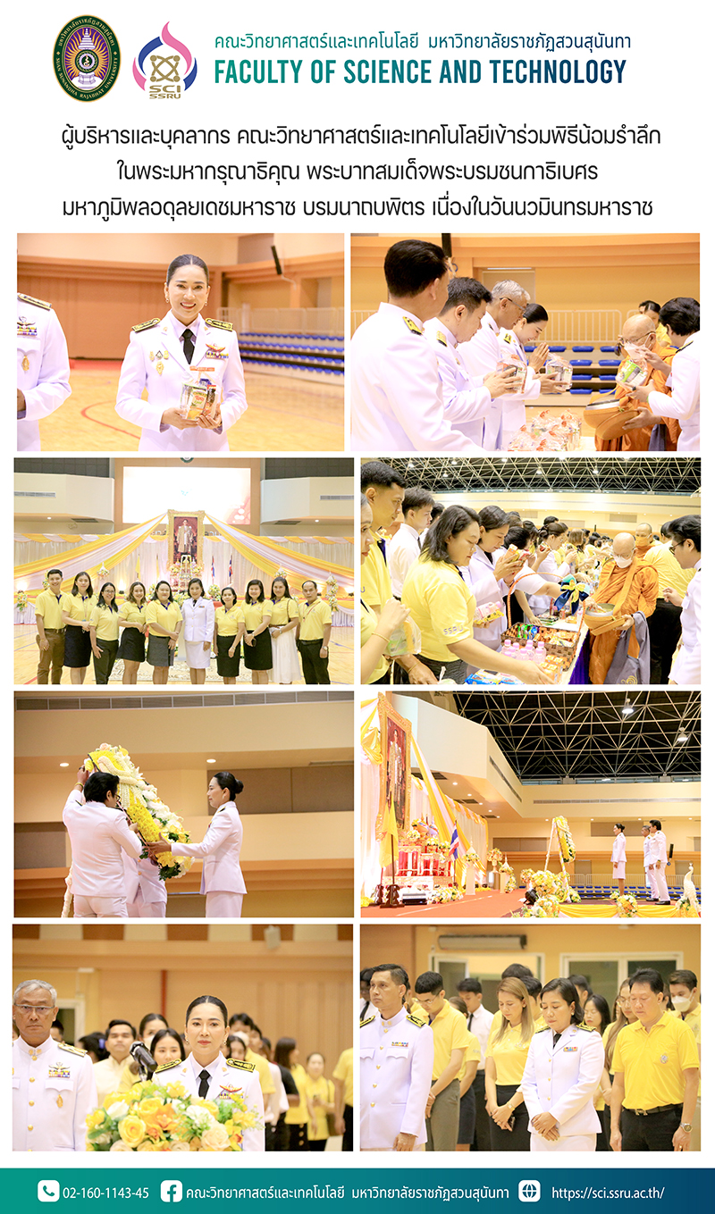 วันพฤหัสบดีที่ 12 ตุลาคม 2566 รองศาสตราจารย์ ดร.ชัยศรี ธาราสวัสดิ์พิพัฒน์ คณบดีคณะวิทยาศาสตร์และเทคโนโลยี ได้มอบหมายให้ ผู้ช่วยศาสตราจารย์ ดร.ฒาลิศา เนียมมณี รองคณบดีฝ่ายบริหาร เข้าร่วมพิธีน้อมรำลึกในพระมหากรุณาธิคุณ พระบาทสมเด็จพระบรมชนกาธิเบศร มหาภูมิพลอดุลยเดชมหาราช บรมนาถบพิตร เนื่องในวันนวมินทรมหาราช พร้อมด้วย บุคลากรคณะวิทยาศาสตร์และเทคโนโลยี โดยมี รองศาสตราจารย์ ดร.ชุติกาญจน์ ศรีวิบูลย์ อธิการบดีมหาวิทยาลัยราชภัฏสวนสุนันทา เป็นประธานในพิธี ณ อาคารศูนย์สุขภาพและกีฬาสวนสุนันทา ชั้น 4 มหาวิทยาลัยราชภัฏสวนสุนันทา