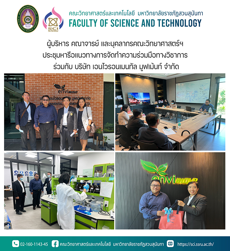 วันที่ 13 กรกฎาคม 2566 ภาคเช้า ผู้บริหารคณะวิทยาศาสตร์และเทคโนโลยี มหาวิทยาลัยราชภัฏสวนสุนันทา นำโดย รองศาสตราจารย์ ดร.ชัยศรี ธาราสวัสดิ์พิพัฒน์ คณบดีคณะวิทยาศาสตร์ฯ ผู้ช่วยศาสตราจารย์ ดร.ฒาลิศา เนียมมณี รองคณบดีฝ่ายบริหาร พร้อมด้วยคณาจารย์ รองศาสตราจารย์ศิวพันธุ์ ชูอินทร์ และบุคลากรที่เกี่ยวข้อง ร่วมประชุมหารือแนวทางการจัดทำความร่วมมือทางวิชาการ ร่วมกับ นายพงศกร สง่าผล กรรมการผู้จัดการ บริษัท เอนไวรอนเมนทัล มูฟเม้นท์ จำกัด เพื่อวางกรอบการจัดทำความร่วมมือฯ เพื่อพัฒนาไปสู่การเรียนการสอนในสถานประกอบการจริง ให้นักศึกษามีประสบการณ์ทำงาน ต่อยอดไปสู่การมีงานทำหลังสำเร็จการศึกษา เพื่อตอบสนองยุทธศาสตร์ของมหาวิทยาลัยต่อไป