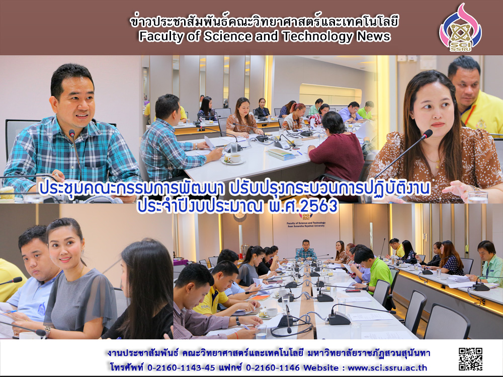 วันที่ 13 พฤศจิกายน 2562 เวลา 10.00-12.00 น. ณ ห้องประชุม 26109 ชั้น 1 คณะวิทยาศาสตร์และเทคโนโลยี อาจารย์ ดร.ชินวัฒน์ ศาสนนันทน์ รองคณบดีฝ่ายแผนงานและประกันคุณภาพ เป็นประธานในการประชุมคณะกรรมการพัฒนา ปรับปรุงกระบวนการปฏิบัติงาน ประจำปีงบประมาณ พ.ศ. 2563 ทั้งนี้มีเรื่องเสนอเพื่อทราบ ดังนี้ รายงานผลการดำเนินการตามกระบวนการสร้างคุณค่าและกระบวนการสนับสนุนที่สำคัญทั้งหมด ประจำปีงบประมาณ พ.ศ. 2562 คำสั่งแต่งตั้งคณะกรรมการพัฒนา ปรับปรุงกระบวนการปฏิบัติงาน ประจำปีงบประมาณ พ.ศ. 2563 แบบฟอร์มรายงานผลการพัฒนา ปรับปรุงกระบวนการปฏิบัติงาน และ เรื่องเสนอเพื่อพิจารณา การทบทวนกระบวนการสร้างคุณค่าและกระบวนการสนับสนุนที่สำคัญทั้งหมด