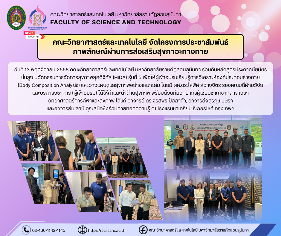 วันที่ 13 พฤศจิกายน 2568 คณะวิทยาศาสตร์และเทคโนโลยี มหาวิทยาลัยราชภัฏสวนสุนันทา ร่วมกับหลักสูตรประกาศนียบัตรชั้นสูง นวัตกรรมการจัดการสุขภาพยุคดิจิทัล (HIDA) รุ่นที่ 5 เพื่อให้ผู้เข้าอบรมเรียนรู้การวิเคราะห์องค์ประกอบร่างกาย (Body Composition Analysis) และวางแผนดูแลสุขภาพอย่างเหมาะสม โดยมี ผศ.ดร.โสพิศ สว่างจิตร รองคณบดีฝ่ายวิจัยและบริการวิชาการ (ผู้เข้าอบรม) ได้ให้คำแนะนำด้านสุขภาพ พร้อมด้วยทีมวิทยากรผู้เชี่ยวชาญจากสาขาวิชาวิทยาศาสตร์การกีฬาและสุขภาพ ได้แก่ อาจารย์ ดร.จรสพร ปัสสาคำ, อาจารย์จตุรภุช บุษรา และอาจารย์เมลานี อุระสนิทซึ่งร่วมถ่ายทอดความรู้ ณ โรงแรมชาเทรียม ริเวอร์ไซด์ กรุงเทพฯ
