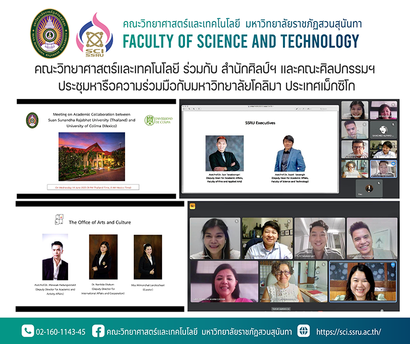 เมื่อวันที่ 14 มิถุนายน 2566 คณะวิทยาศาสตร์และเทคโนโลยี ร่วมกับ สำนักศิลป์ฯ และคณะศิลปกรรมฯ เข้าร่วมประชุมหารือความร่วมมือทางวิชาการกับมหาวิทยาลัยโคลิมา ประเทศเม็กซิโก โดย ผู้ช่วยศาสตราจารย์ ดร.โสพิศ สว่างจิตร รองคณบดีฝ่ายวิชาการ คณะวิทยาศาสตร์และเทคโนโลยี ร่วมกับ สำนักศิลปะและวัฒนธรรม มหาวิทยาลัยราชภัฏสวนสุนันทา นำโดยผู้ช่วยศาสตราจารย์ ดร.วนศักดิ์ ผดุงเศรษฐกิจ รองผู้อำนวยการฝ่ายวิชาการและกิจกรรม อาจารย์ ดร.นันทิดา โอฐกรรม รองผู้อำนวยการฝ่ายวิเทศสัมพันธ์และความร่วมมือ นางสาววิมลฉัตร์ เลิศคชสีห์ ภัณฑารักษ์ และคณะศิลปกรรมฯ โดย ผู้ช่วยศาสตราจารย์ ดร.สรร ถวัลย์วงศ์ศรี รองคณบดีฝ่ายวิชาการ โดยมี Miss Garcia Valencia Head of Office of International Affairs and Foreign Academic Offer เป็นตัวแทนจากมหาวิทยาลัยโคลิมา ประเทศเม็กซิโก การประชุมในรูปแบบออนไลน์ผ่านทางระบบ Google Meet
