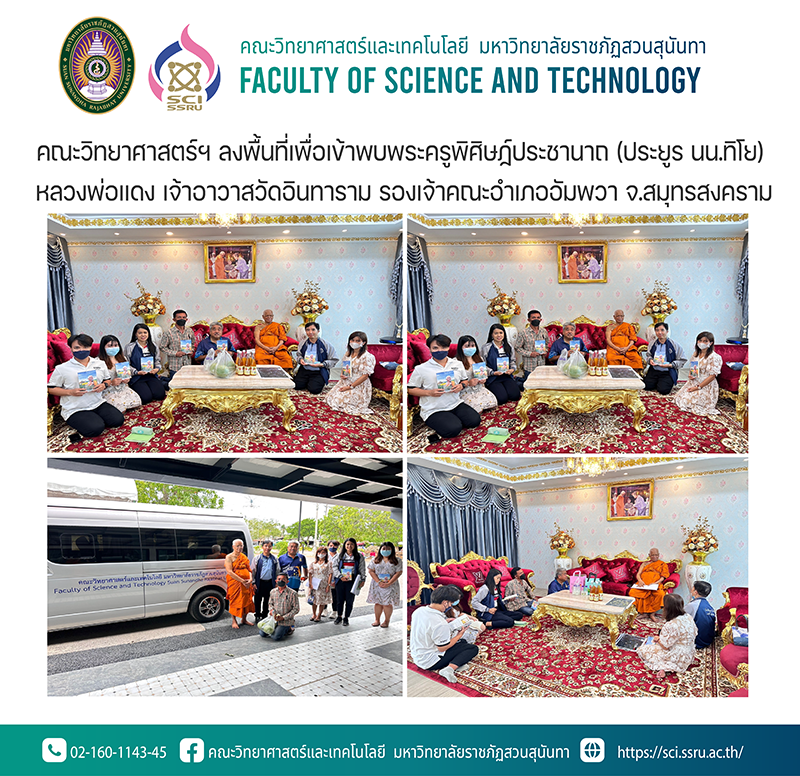 วันศุกร์ที่ 14 กรกฎาคม 2566 รองศาสตราจารย์ ดร.ชัยศรี ธาราสวัสดิ์พิพัฒน์ คณบดีคณะวิทยาศาสตร์และเทคโนโลยี มหาวิทยาลัยราชภัฏสวนสุนันทา นำทีมอาจารย์ และนักวิจัยลงพื้นที่เพื่อเข้าพบพระครูพิศิษฏ์ประชานาถ (ประยูร นน.ทิโย) หลวงพ่อแดง เจ้าอาวาสวัดอินทาราม รองเจ้าคณะอำเภออัมพวา จังหวัดสมุทรสงคราม เพื่อเก็บข้อมูลน้ำเพื่อชีวิต และแลกเปลี่ยนเรียนรู้แม่กลองเมือง 3 น้ำ คือ น้ำเค็ม น้ำกล่อย น้ำจืด สร้างความร่วมมือเครือข่ายภาคประชาชนเพื่อบริหารจัดการน้ำในชุมชน และพัฒนาการเรียนรู้ สู่การจัดทำหลักสูตรระยะสั้น short course ให้กับโรงเรียนในเครือข่ายจังหวัดสมุทรสงคราม