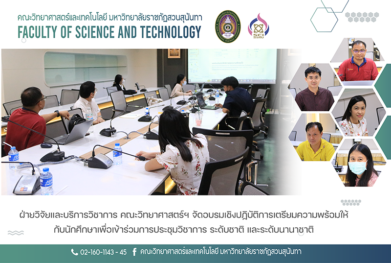 วันที่ 14 กรกฎาคม 2566 ฝ่ายวิจัยและบริการวิชาการ คณะวิทยาศาสตร์และเทคโนโลยี มหาวิทยาลัยราชภัฏสวนสุนันทา จัดอบรมเชิงปฏิบัติการ เพื่อเตรียมความพร้อมให้กับนักศึกษาที่เข้าร่วมการประชุมวิชาการระดับชาติ และนานาชาติ โดยมีผู้ทรงคุณวุฒิ ผู้ช่วยศาสตราจารย์ ดร.ชาติ ทีฆะ เป็นวิทยากรเพื่อเตรียมความพร้อมในการนำเสนอผลงานให้กับนักศึกษา ในการประชุมวิชาการระดับชาติ ครั้งที่ 34 และนานาชาติ ครั้งที่ 1 มหาวิทยาลัยทักษิณ ประจำปี 2566 (The 34 th National Conference and The 1st International Conference on ASEAN Sustainable Development (ICASD 2023) ระหว่างวันที่ 19 - 21 กรกฎาคม 2566 ณ โรงเเรมคริสตัล หาดใหญ่ อำเภอหาดใหญ่ จังหวัดสงขลา