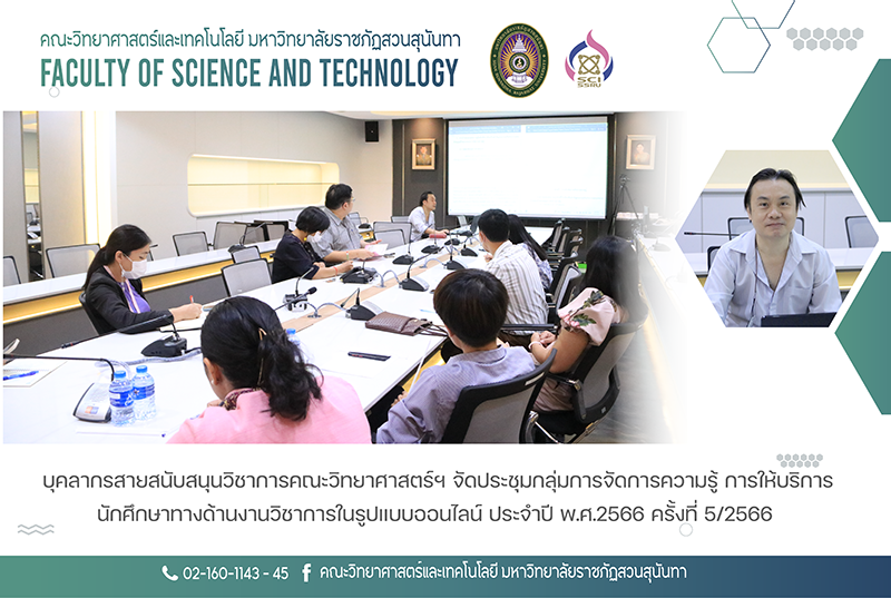 เมื่อวันที่14 กรกฎาคม 2566 บุคลากรสายสนับสนุนวิชาการ คณะวิทยาศาสตร์และเทคโนโลยี จัดประชุมกลุ่มการจัดการความรู้ การให้บริการนักศึกษาทางด้านงานวิชาการในรูปแบบออนไลน์ ประจำปี พ.ศ.2566 ครั้งที่ 5/2566 โดยบุคลากรสายสนับสนุนวิชาการได้แบ่งหน้าที่ในการทำรายงานการให้บริการนักศึกษาทางด้านงานวิชาการในรูปแบบออนไลน์ คณะวิทยาศาสตร์และเทคโนโลยี และสมัครเข้าร่วมการสรรหาแนวปฏิบัติที่ดีของกลุ่มความรู้ ณ ห้องประชุม 26109 ชั้น 1 อาคาร 26 คณะวิทยาศาสตร์และเทคโนโลยี