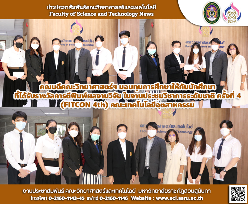 วันพุธที่ 15 มิถุนายน 2565 รองศาสตราจารย์ ดร.ชัยศรี ธาราสวัสดิ์พิพัฒน์ คณบดีคณะวิทยาศาสตร์และเทคโนโลยี ได้มอบทุนการศึกษา ให้แก่นักศึกษาที่ได้รับรางวัลการตีพิมพ์ผลงานวิจัย จากการเข้าร่วมงานประชุมวิชาการระดับชาติ คณะเทคโนโลยีอุตสาหกรรม มหาวิทยาลัยราชภัฏสวนสุนันทา ครั้งที่ 4 (FITCON 4th) โดยมีนักศึกษาที่ได้รับรางวัลดังกล่าว ดังนี้ นางสาวชาลิณี อ้วนผุย นักศึกษาแขนงวิชาเคมี สาขาวิทยาศาสตร์และนวัตกรรม นายเอื้ออังกูรชอนดอก นางสาวนภัสสรณ์ จุนแสง และ นายจีรภัทร์ หมัดละ นักศึกษาแขนงวิชาการจัดการนวัตกรรมดิจิทัล สาขาการจัดการนวัตกรรมดิจิทัลและคอนเทนท์ คณะวิทยาศาสตร์และเทคโนโลยี