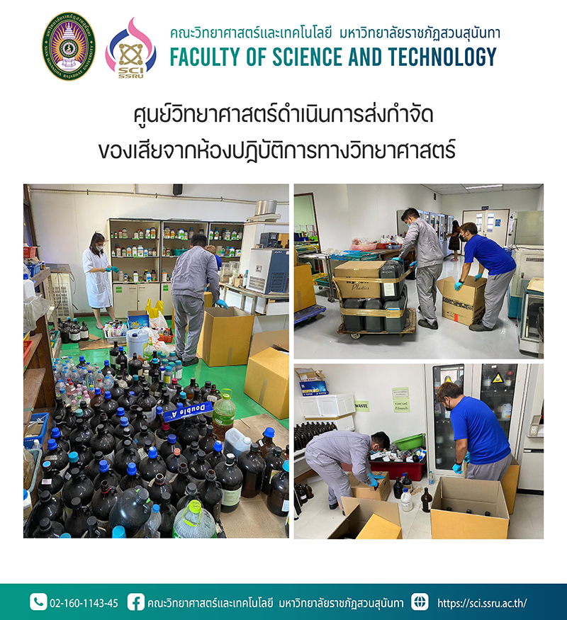 เมื่อวันศุกร์ที่ 14 กรกฎาคม 2566 ที่ผ่านมา ศูนย์วิทยาศาสตร์ คณะวิทยาศาสตร์และเทคโนโลยี มหาวิทยาลัยราชภัฏสวนสุนันทา โดยผู้ช่วยศาสตราจารย์ ดร.พรรณทิพย์ กาหยี (ผู้อำนวยการศูนย์วิทยาศาสตร์) ได้ดำเนินการส่งกำจัดของเสียจากห้องปฏิบัติการทางวิทยาศาสตร์ สารเคมีหมดอายุ ภาชนะบรรจุสารเคมี จากห้องปฏิบัติการทางวิทยาศาสตร์ของศูนย์วิทยาศาสตร์ โดยมีหน่วยงานผู้ได้รับอนุญาตในการขนส่งและกำจัดของเสียอันตรายจากภายนอก เข้ามาดำเนินการเก็บขนและนำไปกำจัดด้วยวิธีการที่ถูกต้อง เหมาะสมต่อไป
