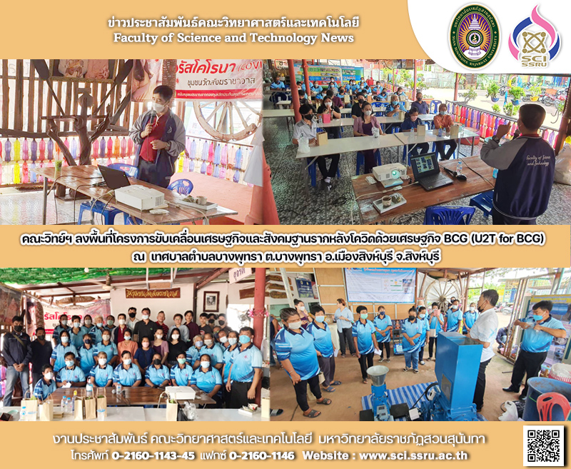 เมื่อวันที่ 13 ส.ค.2565 รศ.ดร.ชัยศรี ธาราสวัสดิ์พิพัฒน์ คณบดีคณะวิทยาศาสตร์และเทคโนโลยี พร้อมด้วยอาจารย์สาขาวิชาชีววิทยาสิ่งแวดล้อม ลงพื้นที่โครงการขับเคลื่อนเศรษฐกิจและสังคมฐานรากหลังโควิดด้วยเศรษฐกิจ BCG (U2T for BCG) ณ เทศบาลตำบลบางพุทรา ต.บางพุทรา อ.เมืองสิงห์บุรี จ.สิงห์บุรี