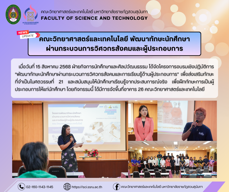 เมื่อวันที่ 15 สิงหาคม 2568 ณ อาคาร 26 คณะวิทยาศาสตร์และเทคโนโลยี ฝ่ายกิจการนักศึกษาและศิลปวัฒนธรรม ได้จัดโครงการอบรมเชิงปฏิบัติการ “พัฒนาทักษะนักศึกษาผ่านกระบวนการวิศวกรสังคมและการเรียนรู้ด้านผู้ประกอบการ” เพื่อส่งเสริมทักษะที่จำเป็นในศตวรรษที่ 21 และสนับสนุนให้นักศึกษาเรียนรู้จากประสบการณ์จริง โดยบูรณาการร่วมกับการฝึกทักษะผู้ประกอบการ เช่น การขาย การคิดต้นทุน-กำไร และการวางแผนธุรกิจเบื้องต้น กิจกรรมดำเนินการในรูปแบบถ่ายทอดความรู้โดยคณะกรรมการสโมสรนักศึกษาที่ผ่านการอบรม เพื่อให้เกิดการแลกเปลี่ยนเรียนรู้ระหว่างนักศึกษาด้วยกัน และสร้างเครือข่ายการเรียนรู้ที่ยั่งยืน และยังเชื่อมโยงสู่ กิจกรรมตลาดนักศึกษา Sci-Tech Fun Fair 2025 ซึ่งเป็นเวทีให้นักศึกษาได้นำผลิตภัณฑ์จากรายวิชา/หลักสูตร รวมถึงสินค้าที่นักศึกษาสนใจ มาจำหน่ายจริง เพื่อฝึกทักษะการเป็นผู้ประกอบการ