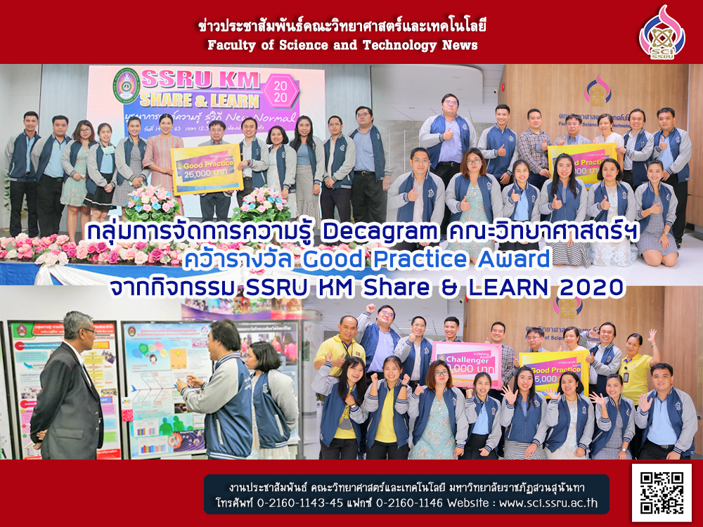 เมื่อวันที่ 14 กันยายน 2563 กองนโยบายและแผน มหาวิทยาลัยราชภัฎสวนสุนันทา ได้จัดงาน SSRU KM Share & LEARN 2020 ณ ห้องประชุมช่อแก้ว ชั้น 5 อาคาร 31 โดย ผศ.ดร.อาณัติ ต๊ะปินตา คณบดีคณะวิทยาศาสตร์และเทคโนโลยี ผู้บริหาร และเจ้าหน้าที่ เข้าร่วมกิจกรรมดังกล่าว เพื่อเป็นการพัฒนาองค์กรแห่งการเรียนรู้ ทั้งนี้ กลุ่ม Decagram เรื่อง คู่มือถาม – ตอบ ประเด็นปัญหาด้านวิชาการ การให้บริการนักศึกษา ณ จุดบริการ One Stop Service (ด้านการลงทะเบียนเรียนของนักศึกษา) ได้คว้ารางวัลที่ 1 Good Practice เงินรางวัล 25,000 บาท