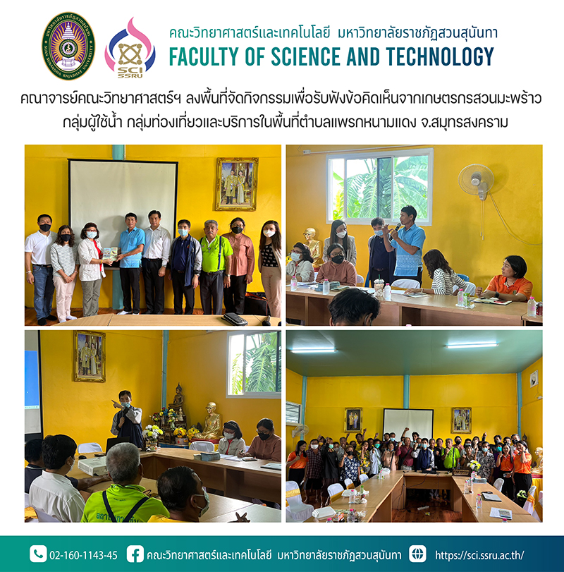 วันศุกร์ที่ 15 กันยายน 2566 รองศาสตราจารย์ ดร.ชัยศรี ธาราสวัสดิ์พิพัฒน์ คณบดีคณะวิทยาศาสตร์และเทคโนโลยี มหาวิทยาลัยราชภัฏสวนสุนันทา พร้อมด้วยทีมคณาจารย์ลงพื้นที่จัดกิจกรรมเพื่อรับฟังข้อคิดเห็นจากการศึกษาวิจัย โดยมีกลุ่มผู้แทนจากเกษตรกรสวนมะพร้าว กลุ่มผู้ใช้น้ำ กลุ่มท่องเที่ยวและบริการ ในพื้นที่ตำบลแพรกหนามแดง เข้าร่วมประชุม ณ โรงเรียนบ้านแพรกหนามแดง อ.อัมพวา จ.สมุทรสงคราม