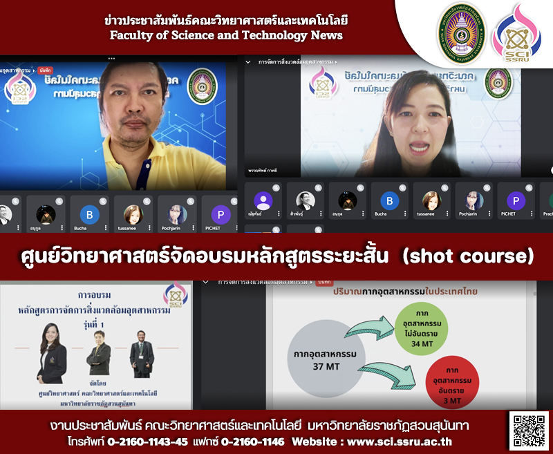 เมื่อวันอาทิตย์ที่ 13 มีนาคม 2565 ที่ผ่านมา ศูนย์วิทยาศาสตร์ คณะวิทยาศาสตร์และเทคโนโลยี มหาวิทยาลัยราชภัฏสวนสุนันทา ได้จัดอบรมหลักสูตรระยะสั้น “หลักสูตรการจัดการสิ่งแวดล้อมอุตสาหกรรม” เป็นวันที่ 5 ในหัวข้อ “การจัดการกากอุตสาหกรรม” บรรยายโดย ผู้ช่วยศาสตราจารย์ ดร.พรรณทิพย์ กาหยี ผู้อำนวยการศูนย์วิทยาศาสตร์