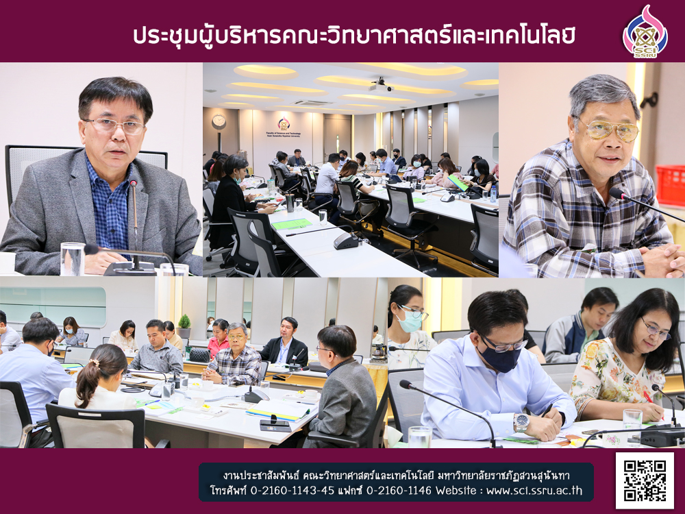 วันพุธ ที่ 16 กันยายน 2563 เวลา 13.30 – 16.30 น. ณ ห้องประชุม 26109 ชั้น 1 คณะวิทยาศาสตร์และเทคโนโลยี ผู้ช่วยศาสตราจารย์ ดร.อาณัติ ต๊ะปินตา คณบดีคณะวิทยาศาสตร์และเทคโนโลยี เป็นประธานในการประชุมผู้บริหารคณะวิทยาศาสตร์และเทคโนโลยี ครั้งที่ 7/2563 ทั้งนี้การประชุมมีเรื่องเสนอเพื่อทราบ อาทิ การชี้แจงแนวทางในการใช้แบบประเมินใหม่สำหรับสายวิชาการและสายสนับสนุนวิชาการ ปีงบประมาณ พ.ศ.2564 สรุปผลการประเมินคุณภาพการศึกษาภายในระดับหลักสูตรและระดับคณะ ปีการศึกษา 2562 แนวปฏิบัติการบริหารจัดการระบบการคัดเลือกกลางบุคคลเข้าศึกษาในสถาบันอุดมศึกษา ปีการศึกษ 2564 ปฏิทินการดำเนินงานการรับสมัครนักศึกษาระดับปริญญาตรี ภาคปกติและภาคพิเศษ ประจำปีการศึกษา 2564 และเรื่องเสนอเพื่อพิจารณา การจัดทำ (ร่าง) แผนปฏิบัติการระดับสาขาวิชา ประจำปีงบประมาณ พ.ศ.2564 ตามยุทธศาสตร์มหาวิทยาลัยราชภัฏสวนสุนันทา