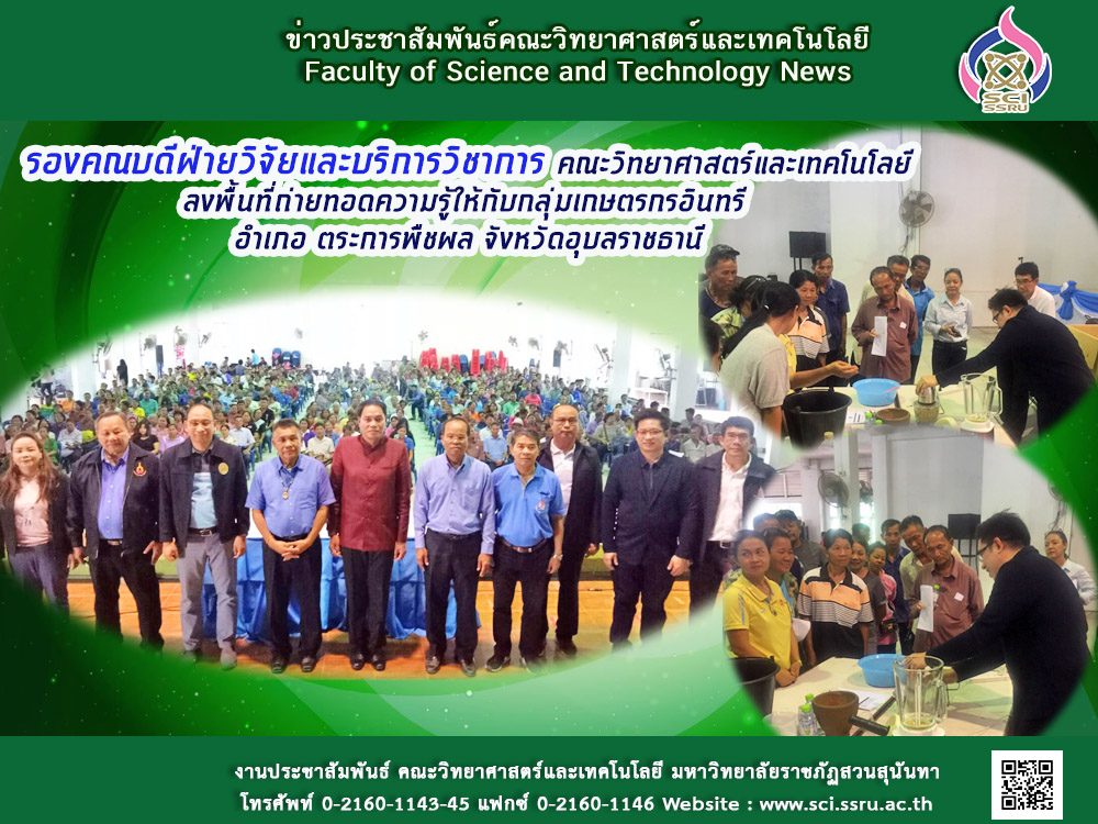 วันที่ 16 พฤศจิกายน 2561 ทีมคณะวิจัย คณะวิทยาศาสตร์และเทคโนโลยี สำนักวิจัยและพัฒนา และบัณฑิตวิทยาลัย นำความรู้การแปรรูปอาหารจากผลงานวิจัยของ อาจารย์ ดร.วัฒนา พันธุ์พืช รองคณบดีฝ่ายวิจัยและบริการวิชาการ คณะวิทยาศาสตร์และเทคโนโลยี ลงพื้นที่ ถ่ายทอดความรู้ลงสู่ปฎิบัติต่อกลุ่มเกษตรกรอินทรี อำเภอ ตระการพืชผล จังหวัดอุบลราชธานี จำนวน 530 คน นายอำเภอตระการ เกษตรอำเภอ กล่าวขอบคุณมหาวิทยาลัยที่ให้โอกาสเกษตรมีความรู้เพิ่มเติมด้านนี้และกล่าวว่า“ไม่เคยมีมหาวิทยาลัยมาลงพื้นที่ให้ความรู้แบบนี้มาก่อน”
