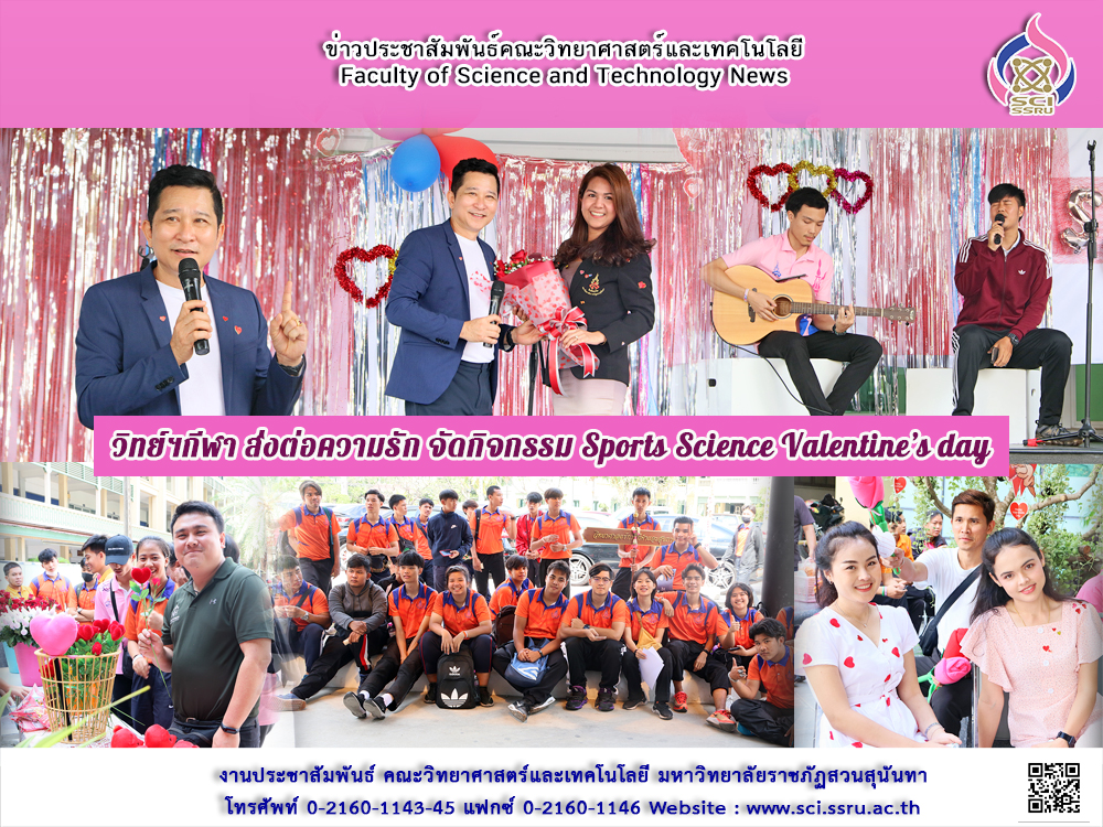 เมื่อวันที่ 14 กุมภาพันธ์ 2563 สาขาวิชาวิทยาศาสตร์การกีฬาและสุขภาพ คณะวิทยาศาสตร์และเทคโนโลยี จัดกิจกรรมต้อนรับวาเลนไทน์ Sports Science Valentine’s day ณ บริเวณหน้าอาคารวิทยาศาสตร์ (23) ทั้งนี้เพื่อเป็นการส่งต่อความรัก เสริมสร้างความสัมพันธ์อันดีร่วมกัน เนื่องในวันแห่งความรัก