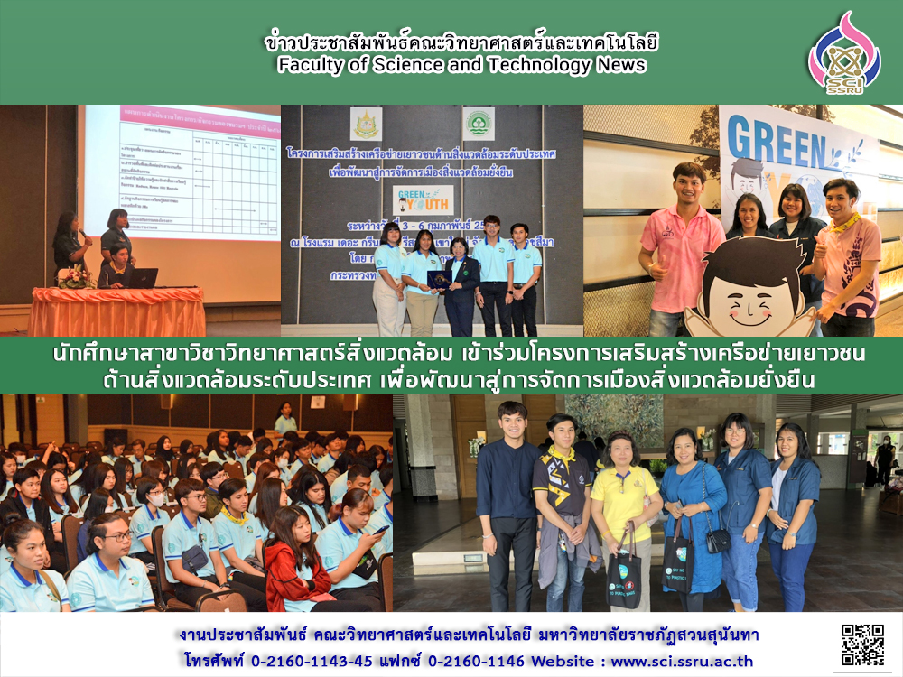 เมื่อวันที่ 3-6 กุมภาพันธ์ 2563 ที่ผ่านมา นักศึกษาสาขาวิชาวิทยาศาสตร์สิ่งแวดล้อม คณะวิทยาศาสตร์และเทคโนโลยี มหาวิทยาลัยราชภัฏสวนสุนันทา ได้เข้าร่วมโครงการเสริมสร้างเครือข่ายเยาวชนด้านสิ่งแวดล้อมระดับประเทศ เพื่อพัฒนาสู่การจัดการเมืองสิ่งแวดล้อมยั่งยืน ที่จัดขึ้นโดย กรมส่งเสริมคุณภาพสิ่งแวดล้อม ณ โรงแรมเดอะกรีนเนอรี่ รีสอร์ท เขาใหญ่ จังหวัดนครราชสีมา ทั้งนี้เพื่อให้เครือข่ายเยาวชนด้านสิ่งแวดล้อมได้พัฒนาศักยภาพและส่งเสริมให้มีบทบาทในการแสดงความคิดเห็น แลกเปลี่ยนประสบการณ์ในการดำเนินกิจกรรมด้านสิ่งแวดล้อม  ยกระดับแนวทางการดำเนินกิจกรรมด้านสิ่งแวดล้อมในมหาวิทยาลัย ซึ่งในครั้งนี้นักศึกษาสาขาวิชาวิทยาศาสตร์สิ่งแวดล้อม ได้เข้าร่วมกิจกรรมนำเสนอผลการดำเนินโครงการด้านสิ่งแวดล้อมของเยาวชนภายในมหาวิทยาลัย (Green Youth) ประจำปี 2562 ซึ่งประโยชน์ที่ได้รับจากการเข้าร่วมกิจกรรมในครั้งนี้ทำให้นักศึกษาเกิดความสัมพันธ์และความเข้าใจอันดีระหว่างกลุ่มเยาวชน ร่วมกันพิทักษ์ รักษาและฟื้นฟูทรัพยากรธรรมชาติและสิ่งแวดล้อม รวมถึงการแลกเปลี่ยนประสบการณ์การทำงานด้านสิ่งแวดล้อมร่วมกัน อีกด้วย