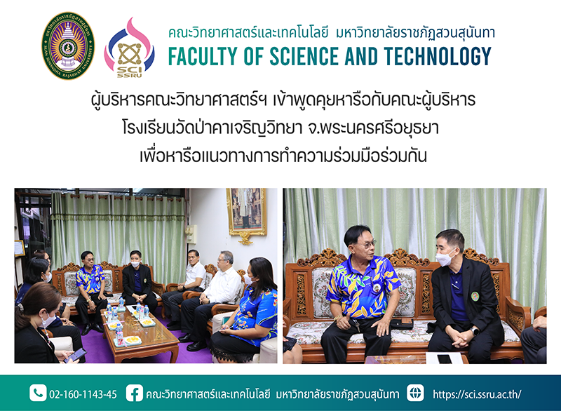 วันศุกร์ที่ 17 พฤศจิกายน 2566 เวลา 10.00 น. รองศาสตราจารย์ ดร.ชัยศรี ธาราสวัสดิ์พิพัฒน์ คณบดีคณะวิทยาศาสตร์และเทคโนโลยี พร้อมด้วย ผู้ช่วยศาสตราจารย์ ดร.ฒาลิศา เนียมมณี รองคณบดีฝ่ายบริหาร อาจารย์และเจ้าหน้าที่ที่เกี่ยวข้อง เข้าพบคณะผู้บริหารโรงเรียนวัดป่าคาเจริญวิทยา อำเภอบางไทร จังหวัดพระนครศรีอยุธยา เพื่อหารือแนวทางการทำความร่วมมือร่วมกัน และการจัดกิจกรรมต่างๆ ให้กับนักเรียนและบุคลากร
