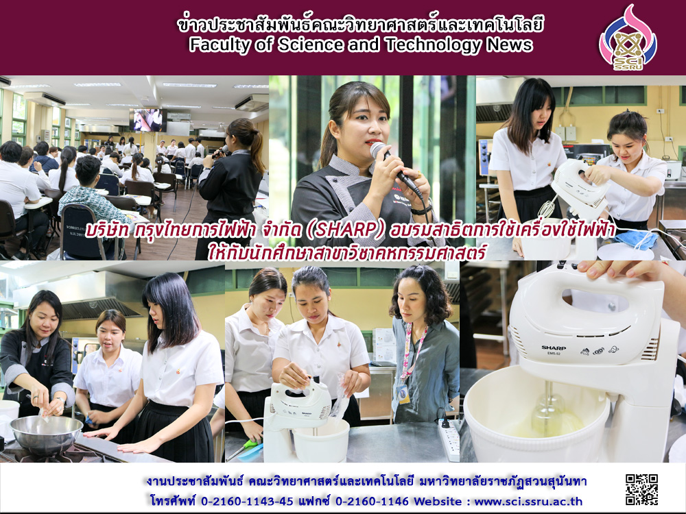 วันที่ 18 มีนาคม 2562 สาขาวิชาคหกรรมศาสตร์คณะวิทยาศาสตร์และเทคโนโลยี ได้รับเกียรติจาก คุณปภาภัทร จันทร์สว่างคุณภรณ์ทิพย์ สาระพันธ์ และ คุณศศิมล ศรีกนก จาก บริษัท กรุงไทยการไฟฟ้า จำกัด (SHARP) มาอบรมสาธิตการใช้เครื่องใช้ไฟฟ้า ด้วย เมนูข้าวมันไก่ ทำจากหม้อหุงข้าว และเค้กไข่ไต้หวัน ให้กับนักศึกษาสาขาวิชาคหกรรมศาสตร์ ชั้นปีที่ 3 จำนวน 50 คน