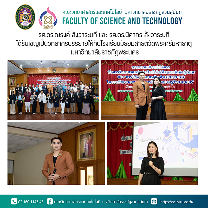 เมื่อวันเสาร์ที่ 18 มีนาคม 2566 รองศาสตราจารย์ ดร.ณรงค์ สังวาระนที และ รองศาสตราจารย์ ดร.นิศากร สังวาระนที อาจารย์ประจำสาขาวิชาวิทยาศาสตร์และนวัตกรรม คณะวิทยาศาสตร์และเทคโนโลยี มหาวิทยาลัยราชภัฏสวนสุนันทา ได้รับเกียรติเป็นวิทยากรบรรยายให้ความรู้ในหัวข้อ "สื่อสารวิทยาศาสตร์อย่างไร ให้เข้าใจและเข้าถึงผู้เรียน" โดยมีวัตถุประสงค์เพื่อพัฒนาสมรรถนะการสื่อสารของครูวิทยาศาสตร์ ณ ห้องประชุม พล.อ.อ.ปอง มณีศิลป์ โรงเรียนมัธยมสาธิตวัดพระศรีมหาธาตุ มหาวิทยาลัยราชภัฏพระนคร กรุงเทพมหานคร
