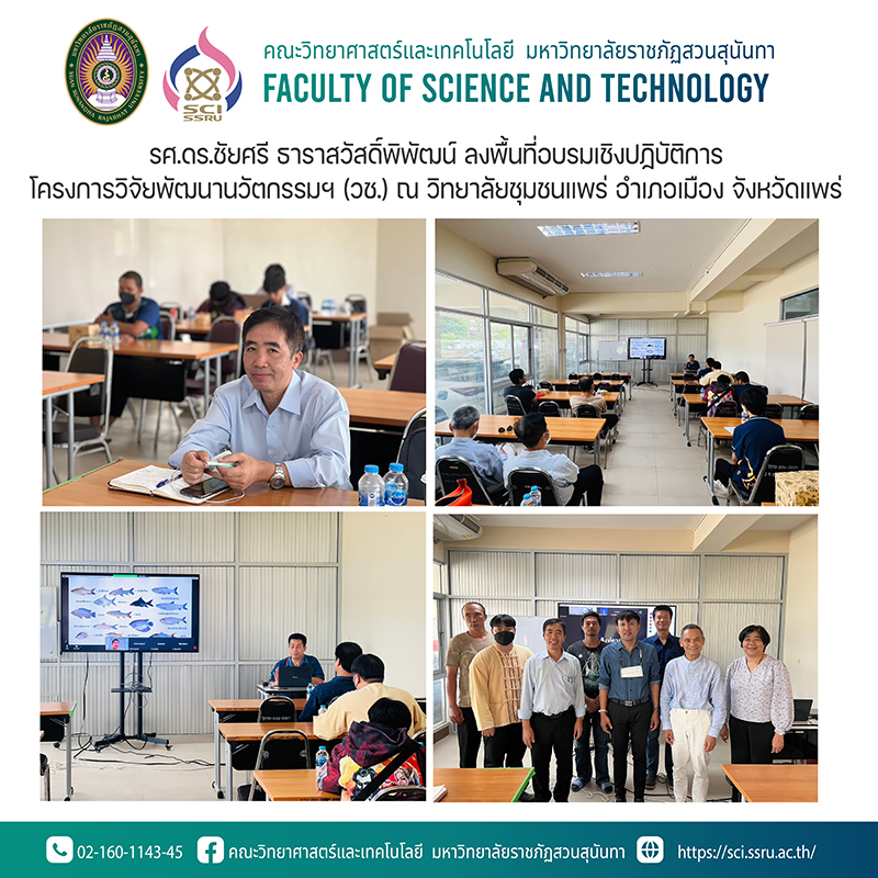 วันอังคารที่ 18 เมษายน 2566 รศ.ดร.ชัยศรี ธาราสวัสดิ์พิพัฒน์ คณบดีคณะวิทยาศาสตร์และเทคโนโลยี มหาวิทยาลัยราชภัฏสวนสุนันทา ลงพื้นที่อบรมเชิงปฏิบัติการโครงการวิจัยพัฒนานวัตกรรมฯ (วช) ภายใต้หัวข้อเรื่อง "การพัฒนาต้นแบบนวัตกรรมการจัดการเกษตรผสมผสาน ตามหลักเกษตรทฤษฎีใหม่ เพื่อรองรับการจัดหลักสูตรการเรียนรู้คู่การทำงาน" ของคณะกรรมการธิการอุดมศึกษา วิทยาศาสตร์ วิจัยและนวัตกรรม วุฒิสภา ซึ่งเป็นโครงการความร่วมมือระหว่าง 3 หน่วยงาน ประกอบด้วย มหาวิทยาลัยราชภัฏสวนสุนันทา , มหาวิทยาลัยราชภัฏอุตรดิตถ์ และ วิทยาลัยชุมชนแพร่ โดยจัดกิจกรรมอบรมเชิงปฏิบัติการ "นวัตกรรมการจัดการเลี้ยงปลาและกบพื้นถิ่นแบบทันสมัย" ให้กับครู อาจารย์ นักศึกษา กลุ่มเกษตรกร และชาวบ้าน ทั้งในรูปแบบผสมผสานและรูปแบบออนไลน์ ณ วิทยาลัยชุมชนแพร่ อำเภอเมือง จังหวัดแพร่