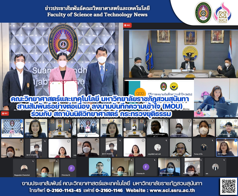 วันพฤหัสบดี ที่ 19 พฤษภาคม 2565 รองศาสตราจารย์ ดร.ชุติกาญจน์ ศรีวิบูลย์ อธิการบดีมหาวิทยาลัยราชภัฏสวนสุนันทา เป็นประธานในพิธีลงนามบันทึกความเข้าใจ (MOU) ระหว่าง มหาวิทยาลัยราชภัฏสวนสุนันทา กับ สถาบันนิติวิทยาศาสตร์ กระทรวงยุติธรรม พร้อมด้วย รองศาสตราจารย์ ดร.ชัยศรี ธาราสวัสดิ์พิพัฒน์ คณบดีคณะวิทยาศาสตร์และเทคโนโลยี รองศาสตราจารย์พิเศษ พลตำรวจโท ดร.ณรงค์ กุลนิเทศ ประธานหลักสูตร ปรัชญาดุษฎีบัณฑิตและวิทยาศาสตรมหาบัณฑิต สาขาวิชานิติวิทยาศาสตร์ ผู้บริหารและคณาจารย์จากสาขาวิชานิติวิทยาศาสตร์ ร่วมในพิธีดังกล่าว โดยได้รับเกียรติจาก พันตำรวจเอกทรงศักดิ์ รักศักดิ์สกุล ผู้อำนวยการสถาบันนิติวิทยาศาสตร์ พันตำรวจโทเชน กาญจนาปัจจ์ รองผู้อำนวยการสถาบันนิติวิทยาศาสตร์ ผู้ช่วยศาสตราจารย์วรวีร์ ไวยวุฒิ รองผู้อำนวยการสถาบันนิติวิทยาศาสตร์ ร่วมลงนามบันทึกความเข้าใจ (MOU) ซึ่งการลงนามในครั้งนี้ เป็นความร่วมมือทางวิชาการอย่างต่อเนื่องระหว่าง คณะวิทยาศาสตร์ฯ และสถาบันนิติวิทยาศาสตร์ เพื่อส่งเสริมการพัฒนาบุคลากรที่มีความรู้ความสามารถทางด้านนิติวิทยาศาสตร์ รวมทั้ง การพัฒนาและผลิตบัณฑิต นักนิติวิทยาศาสตร์ ให้เป็นผู้มีความเชี่ยวชาญด้านนิติวิทยาศาสตร์ อันเป็นประโยชน์ต่อกระบวนการยุติธรรมของประเทศ และเป็นประโยชน์ในการพัฒนางานวิชาการทางด้านนิติวิทยาศาสตร์ในอนาคตต่อไป