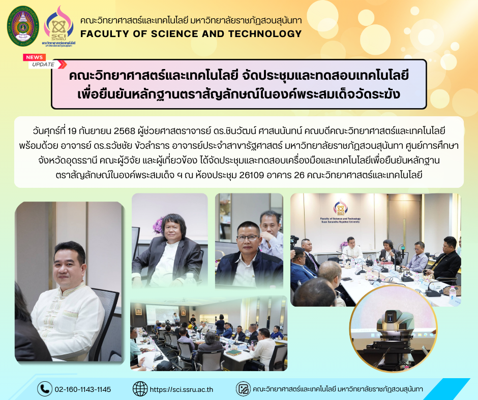 วันศุกร์ที่ 19 กันยายน 2568 ผู้ช่วยศาสตราจารย์ ดร.ชินวัฒน์ ศาสนนันทน์ คณบดีคณะวิทยาศาสตร์และเทคโนโลยี พร้อมด้วย อาจารย์ ดร.ธวัชชัย ขัวลำธาร อาจารย์ประจำสาขารัฐศาสตร์ มหาวิทยาลัยราชภัฏสวนสุนันทา ศูนย์การศึกษาจังหวัดอุดรธานี คณะผู้วิจัย และผู้เกี่ยวข้อง ได้จัดประชุมและทดสอบเครื่องมือและเทคโนโลยีเพื่อยืนยันหลักฐาน ตราสัญลักษณ์ในองค์พระสมเด็จ ฯ ณ ห้องประชุม 26109 อาคาร 26 คณะวิทยาศาสตร์และเทคโนโลยี