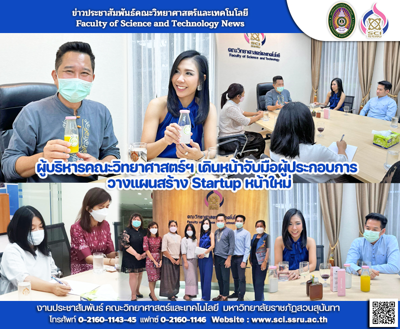 วันศุกร์ที่ 17 มิถุนายน 2565 ผู้ช่วยศาสตราจารย์ ดร.รินรดา พัฒนใหญ่ยิ่ง รองคณบดีฝ่ายวิจัยและบริการวิชาการ ผู้ช่วยศาสตราจารย์ ดร.คมกฤช รัตตะมณี รองคณบดีฝ่ายกิจการนักศึกษา ผู้ช่วยศาสตราจารย์ ดร.ฒาลิศา เนียมมณี รองคณบดีฝ่ายบริหาร พร้อมด้วย คณาจารย์นักวิจัย คณะวิทยาศาสตร์และเทคโนโลยี มหาวิทยาลัยราชภัฏสวนสุนันทา ได้ประชุมหารือร่วมกับ คุณอุรุชา เฉลิมวุฒิกุล CEO จากบริษัท โซ อินโนเวทีฟ จำกัด (SO INNOVATIVE CO.LTD.) เพื่อร่วมวางแผนการสร้าง Startup หน้าใหม่ และเดินหน้าเครือข่ายความร่วมมือกับผู้ประกอบการด้านอาหารเพื่อสุขภาพ และอาหารเชิงฟังก์ชัน