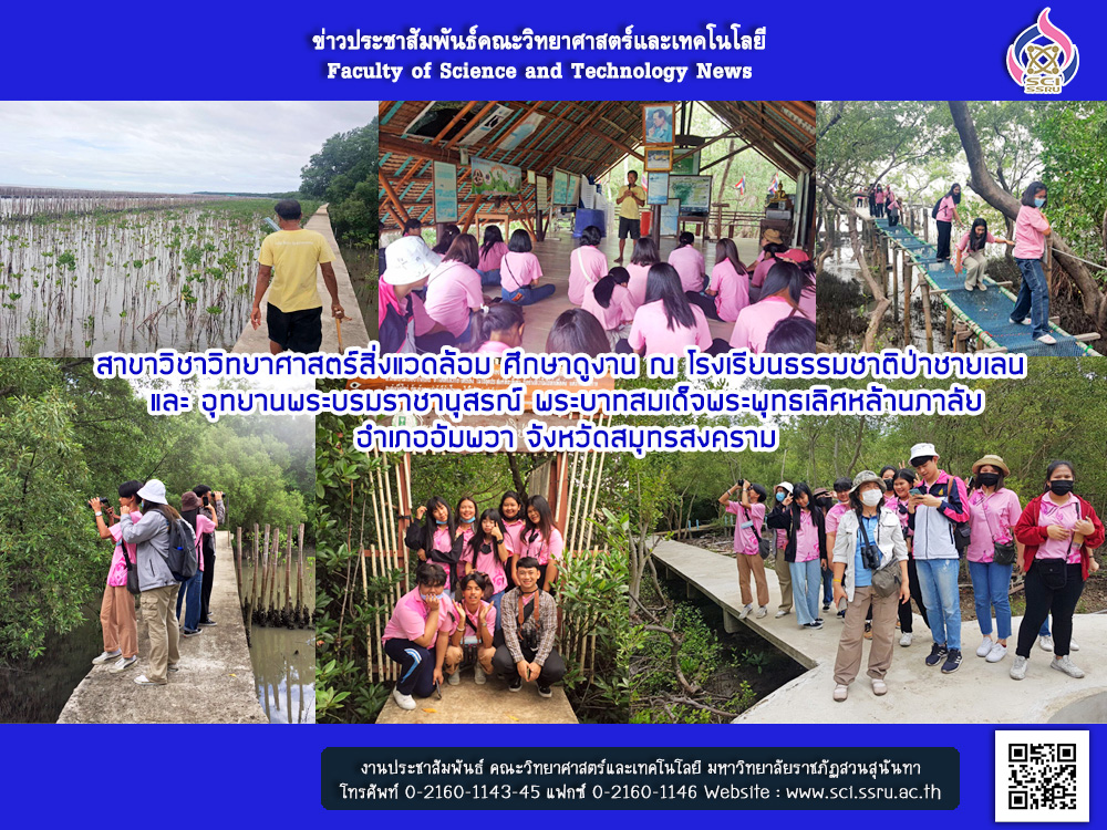 เมื่อวันที่ 11 สิงหาคม 2563 ที่ผ่านมา สาขาวิชาวิทยาศาสตร์สิ่งแวดล้อม คณะวิทยาศาสตร์และเทคโนโลยี มหาวิทยาลัยราชภัฏสวนสุนันทา นำโดย ผู้ช่วยศาสตราจารย์ ดร.ฒาลิศา เนียมมณี หัวหน้าสาขาวิชาวิทยาศาสตร์สิ่งแวดล้อม ผู้ช่วยศาสตราจารย์ศรีสุวรรณ เกษมสวัสดิ์ และ ผู้ช่วยศาสตราจารย์นิธินาถ เจริญโภคราช นำทีมนักศึกษาสาขาวิชาวิทยาศาสตร์สิ่งแวดล้อม จำนวน 40 คน เข้าศึกษาดูงาน ณ โรงเรียนธรรมชาติป่าชายเลน และ อุทยานพระบรมราชานุสรณ์ พระบาทสมเด็จพระพุทธเลิศหล้านภาลัย จังหวัดสมุทรสงคราม ทั้งนี้ ได้รับเกียรติจาก คุณวิสูตร นวมศิริ เป็นวิทยากรบรรยายให้ความรู้