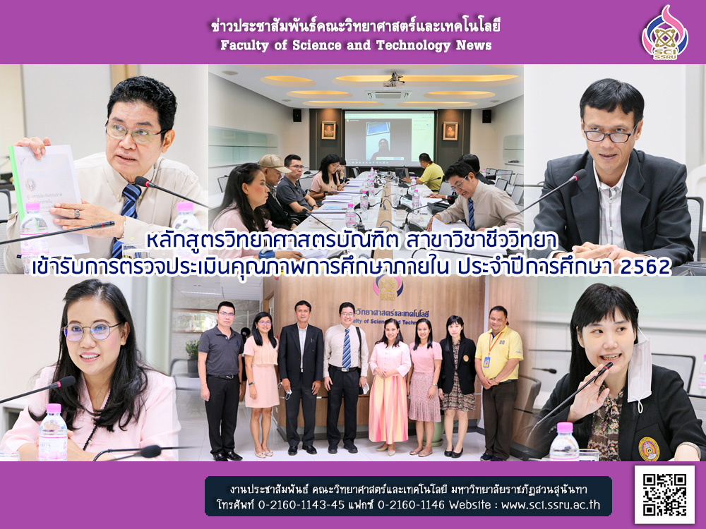 วันพฤหัสบดี ที่ 20 สิงหาคม 2563 ณ ห้องประชุม 26109 ชั้น 1 อาคารคณะวิทยาศาสตร์และเทคโนโลยี หลักสูตรวิทยาศาสตรบัณฑิต สาขาวิชาชีววิทยา เข้ารับการตรวจประเมินคุณภาพการศึกษาภายใน ประจำปีการศึกษา 2562 โดยได้รับเกียรติจากผู้ทรงคุณวุฒิภายนอก จำนวน 3 ท่าน ได้แก่ ผู้ช่วยศาสตราจารย์ ดร.จุมพต พุ่มศรียานนท์ (ประธานกรรมการ) ผู้ช่วยศาสตราจารย์เสาวนิตย์ ชอบบุญ (กรรมการ) ผู้ช่วยศาสตราจารย์รัตนะ ยศเมธากุล (กรรมการ) และ นายอิทธิเชษฐ์ กาฬสุวรรณ (เลขานุการ)