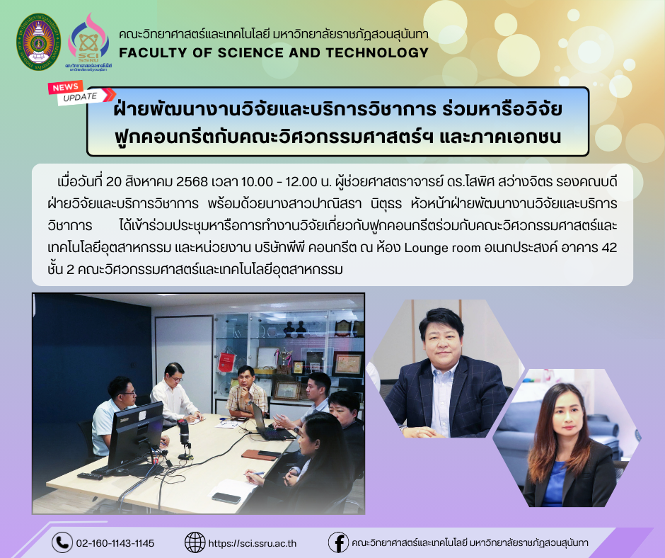 วันพุธที่ 20 สิงหาคม 2568 เวลา 10.00 – 12.00 น. ผู้ช่วยศาสตราจารย์ ดร.โสพิศ สว่างจิตร รองคณบดีฝ่ายวิจัยและบริการวิชาการ พร้อมด้วยนางสาวปาณิสรา นิตุธร หัวหน้าฝ่ายพัฒนางานวิจัยและบริการวิชาการ คณะวิทยาศาสตร์และเทคโนโลยี ได้เข้าร่วมประชุมหารือการทำงานวิจัย ร่วมกับ ผู้ช่วยศาสตราจารย์ ดร.ชนมภัทร โตระสะ คณบดี อาจารย์ ดร.ธรรมรักษ์ ศรีมารุต รองคณบดีฝ่ายวิจัยและบริการวิชาการ คณะวิศวกรรมศาสตร์และเทคโนโลยีอุตสาหกรรม และรองศาสตราจารย์ อรัญ ขวัญปาน หัวหน้าสาขาวิชาเทคโนโลยีความปลอดภัยและอาชีวอนามัย โดยมีคุณกฤต ชัยอมฤต จากหน่วยงาน บริษัทพีพี คอนกรีต มาเข้าร่วมหารือการทำงานวิจัยเกี่ยวกับฟูกคอนกรีต เพื่อจดเป็นผลงานนวัตกรรมในอนาคต ณ ห้อง Lounge room อเนกประสงค์ อาคาร 42 ชั้น 2 คณะวิศวกรรมศาสตร์และเทคโนโลยีอุตสาหกรรม มหาวิทยาลัยราชภัฏสวนสุนันทา