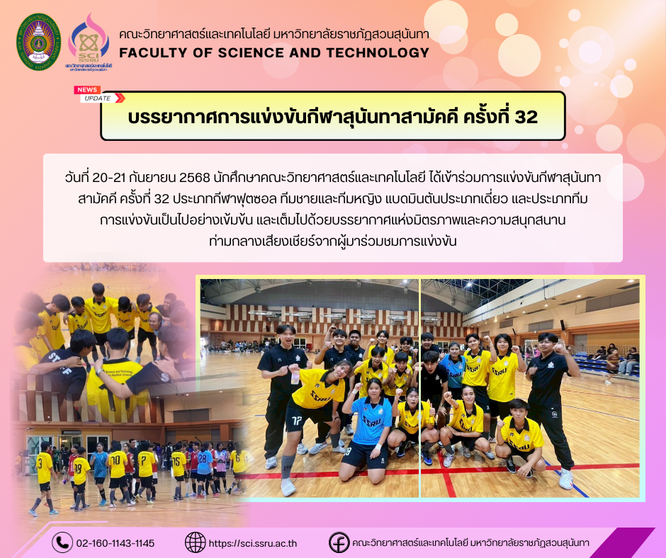 วันที่ 20-21 กันยายน 2568 นักศึกษาคณะวิทยาศาสตร์และเทคโนโลยี ได้เข้าร่วมการแข่งขันกีฬาสุนันทาสามัคคี ครั้งที่ 32 ในหลายประเภทกีฬา ได้แก่ ฟุตซอลทีมชายและทีมหญิง แบดมินตันประเภทเดี่ยว และประเภททีม โดยบรรยากาศการแข่งขันเป็นไปอย่างเข้มข้น เต็มไปด้วยความสนุกสนานและมิตรภาพ ท่ามกลางเสียงเชียร์จากผู้ร่วมชม ณ ชั้น 4 อาคารศูนย์สุขภาพและกีฬา กองพัฒนานักศึกษา ผลการแข่งขันทีมนักกีฬาของคณะฯ สร้างผลงานได้อย่างยอดเยี่ยม กวาดรางวัลรวม 3 เหรียญทอง และ 2 เหรียญเงิน ส่งผลให้คณะวิทยาศาสตร์และเทคโนโลยี ขึ้นนำเป็น อันดับ 1 ของตารางคะแนนรวม ในรอบเดือนกันยายน 2568