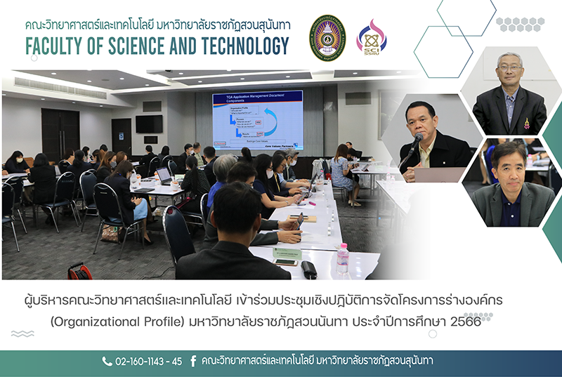 วันพุธที่ 20 ธันวาคม 2566 เวลา 09.00 -12.00 น. รองศาสตราจารย์ ดร.ชัยศรี ธาราสวัสดิ์พิพัฒน์ คณบดีคณะวิทยาศาสตร์และเทคโนโลยี เข้าร่วมประชุมเชิงปฏิบัติการจัดโครงการร่างองค์กร (Organizational Profile) มหาวิทยาลัยราชภัฏสวนนันทา ประจำปีการศึกษา 2566 โดยมี รองศาสตราจารย์ ดร.อนันต์ มุ่งวัฒนา เป็นวิทยากร และมี รองศาสตราจารย์ ดร.วิทยา เมฆขำ รองอธิการบดีฝ่ายแผนงานและประกันคุณภาพ