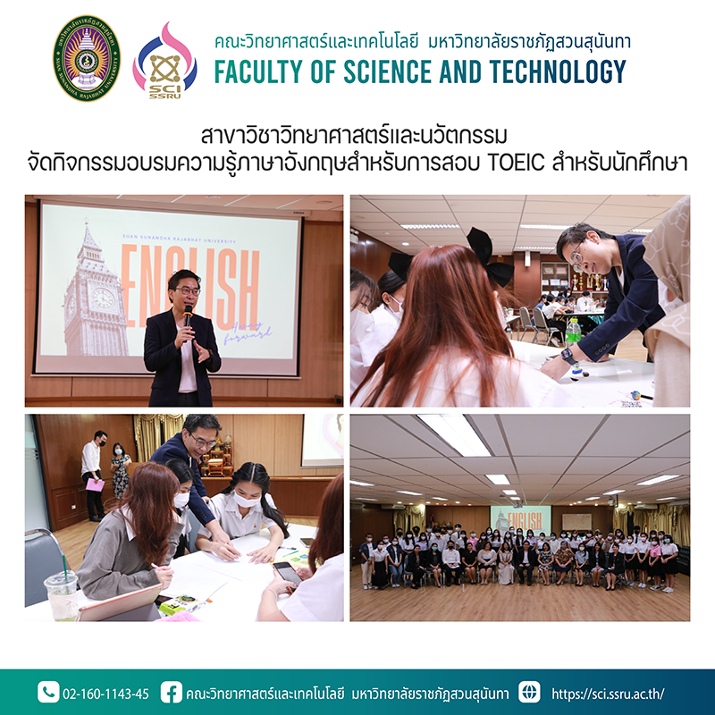 เมื่อวันที่ 21 มีนาคม 2566 สาขาวิชาวิทยาศาสตร์และนวัตกรรม คณะวิทยาศาสตร์และเทคโนโลยี มหาวิทยาลัยราชภัฏสวนสุนันทา จัดกิจกรรมอบรมความรู้ภาษาอังกฤษสำหรับการสอบ TOEIC โดยได้รับเกียรติจาก อาจารย์ ดร.พันธรักษ์ ผูกพันธุ์ ผู้อำนวยการสถาบันภาษา ศิลปะและวัฒนธรรม มหาวิทยาลัยสวนดุสิต และ คุณสัณฑิกา จงรักษ์ ติวเตอร์อิสระ มาเป็นวิทยากรให้ความรู้แก่นักศึกษาสาขาวิชาวิทยาศาสตร์และนวัตกรรม เพื่อเป็นการพัฒนาทักษะในการเตรียมตัวสอบ TOEIC ณ ห้องประชุม 26103 ชั้น 1 คณะวิทยาศาสตร์และเทคโนโลยี