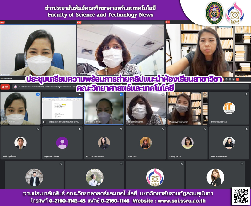 วันอังคาร ที่ 21 มิถุนายน 2565 ผู้ช่วยศาสตราจารย์ ดร.ฒาลิศา เนียมมณี รองคณบดีฝ่ายบริหาร คณะวิทยาศาสตร์และเทคโนโลยี เป็นประธานในการประชุมเตรียมความพร้อมการถ่ายคลิปแนะนำห้องเรียน ห้องปฏิบัติการของสาขาวิชา เพื่อต้อนรับนักศึกษาสู่ปีการศึกษา 2565 ผ่านทาง Google meet ออนไลน์