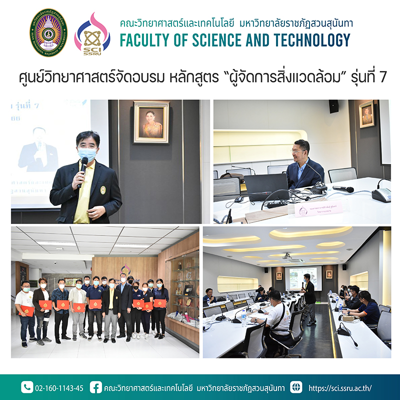 ศูนย์วิทยาศาสตร์ คณะวิทยาศาสตร์และเทคโนโลยี มหาวิทยาลัยราชภัฏสวนสุนันทา จัดอบรมบุคลากรสิ่งแวดล้อมประจำโรงงาน หลักสูตร “ผู้จัดการสิ่งแวดล้อม รุ่นที่ 7” ในวันเสาร์ที่ 17 มิถุนายน 2566 ณ ห้องประชุม 26109 คณะวิทยาศาสตร์และเทคโนโลยี มหาวิทยาลัยราชภัฏสวนสุนันทา โดยได้รับเกียรติจาก รองศาสตราจารย์ ดร.ชัยศรี ธาราสวัสดิ์พิพัฒน์ คณบดีคณะวิทยาศาสตร์และเทคโนโลยี เป็นประธานเปิดและปิดการอบรมในครั้งนี้ และบรรยายในหัวข้อ การจัดการสิ่งแวดล้อมในโรงงานอุตสาหกรรม และรองศาสตราจารย์ศิวพันธุ์ ชูอินทร์ อาจารย์ประจำสาขาวิชาวิทยาศาสตร์และเทคโนโลยีสิ่งแวดล้อม บรรยายในหัวข้อ มลพิษสิ่งแวดล้อม และกฎหมายที่เกี่ยวข้องกับการจัดการสิ่งแวดล้อมโรงงาน โดยผู้ที่ผ่านการอบรมจะสามารถขึ้นทะเบียนเป็นผู้จัดการสิ่งแวดล้อมประจำโรงงานต่อกรมโรงงานอุตสาหกรรมได้
