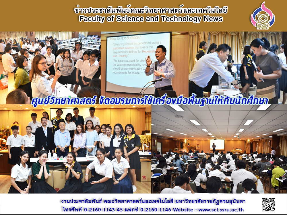 เมื่อวันที่ 15 กุมภาพันธ์ 2562 ศูนย์วิทยาศาสตร์ คณะวิทยาศาสตร์และเทคโนโลยี มหาวิทยาลัยราชภัฏสวนสุนันทา โดย รองศาสตราจารย์ ศิวพันธุ์ ชูอินทร์ ผู้อำนวยการศูนย์วิทยาศาสตร์ ร่วมกับบริษัท Vana science จัด“โครงการอบรมการใช้เครื่องมือพื้นฐานแก่นักศึกษา” (เครื่องชั่งสารและเครื่อง pH-Meter) ซึ่งได้รับเกียรติจาก อาจารย์ ดร.กิตติคุณ มีทองจันทร์ หัวหน้าภาควิชาวิทยาศาสตร์ประยุกต์ เป็นประธานในการโครงการ และโดยได้รับเกียรติจาก คุณวุฒิ เตชะเกษมบัณฑิต ผู้จัดการฝ่ายขายและการตลาดส่วนภูมิภาค บริษัท โอเฮ้าส์ อินโดไชน่า จำกัด เป็นวิทยากรบรรยาย ทั้งนี้โครงการดังกล่าว มีวัตถุประสงค์เพื่อให้นักศึกษามีความรู้ความเข้าใจเกี่ยวกับเครื่องมือพื้นฐานภายในห้องปฏิบัติการ สามารถใช้งานเครื่องมือ และทำการดูแลรักษาเครื่องมือได้อย่างถูกต้อง มีการบรรยายทฤษฎีและการสาธิตการใช้เครื่องมือ การอบรมในครั้งนี้มีนักศึกษาในระดับชั้นปีที่ 2 และ 3 เข้าร่วมประมาณ 150 คน จากสาขาวิชาต่าง ๆ ได้แก่ สาขาวิชานิติวิทยาศาสตร์ สาขาวิชาเคมี สาขาวิชาจุลชีววิทยาอุตสาหกรรม สาขาวิชาชีววิทยา สาขาวิชาฟิสิกส์ประยุกต์ สาขาวิชาวิทยาศาสตร์สิ่งแวดล้อม และสาขาวิชาวิทยาศาสตร์และเทคโนโลยีการอาหาร