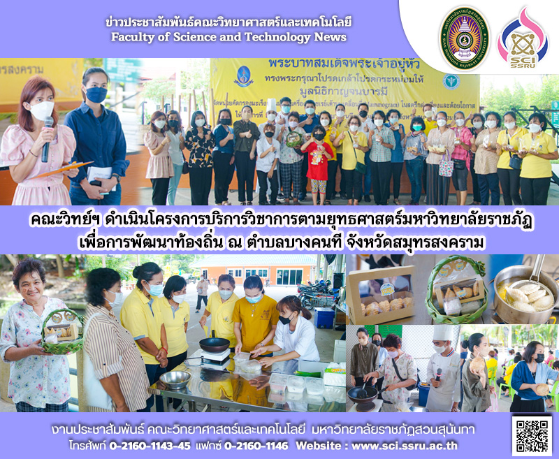 วันจันทร์ที่ 21 มีนาคม 2565 ผู้ช่วยศาสตราจารย์ ดร.รินรดา พัฒนใหญ่ยิ่ง รองคณบดีฝ่ายวิจัยและบริการวิชาการ พร้อมทีมคณาจารย์สาขาคหกรรมศาสตร์ และเจ้าหน้าที่ ร่วมลงพื้นที่ตำบลบางคนที จังหวัดสมุทรสงคราม ดำเนินการโครงการพัฒนาคุณภาพชีวิตและยกระดับรายได้ด้วยวิทยาศาสตร์ เทคโนโลยี และนวัตกรรม (8 ครัวเรือน) ได้มีการอบรมให้ความรู้ในการทำขนมไทย (ขนมขี้หนู-กะหรี่ปั๊ป) แก่ ครัวเรือนในชุมชนบางคนที ณ องค์การบริหารส่วนตำบลบางคนที จังหวัดสมุทรสงคราม เพื่อนำองค์ความรู้ที่ได้ไปต่อยอดอาชีพครัวเรือนต่อไป