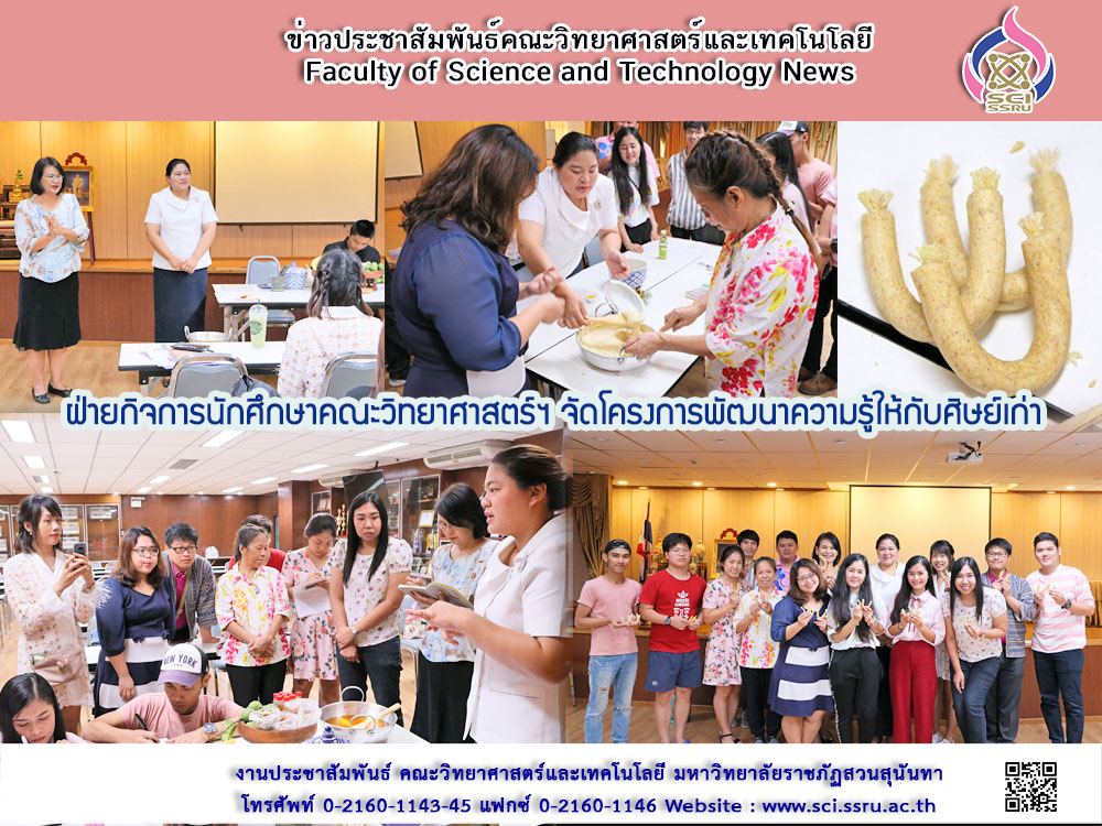 เมื่อวันเสาร์ ที่ 20 กรกฎาคม 2562 ที่ผ่านมา ฝ่ายกิจการนักศึกษา คณะวิทยาศาสตร์และเทคโนโลยี จัดโครงการพัฒนาความรู้และทักษะให้กับศิษย์เก่า เรื่อง “การทำเทียนอบขนมไทยสูตรชาววัง” โดยได้รับเกียรติจาก คุณศิริภัสสร โชควศิน จากวิทยาลัยในวังหญิง มาเป็นวิทยากรให้ความรู้ ทั้งนี้มีศิษย์เก่าจากสาขาวิชาต่างๆ เข้าร่วมอบรมจำนวนทั้งสิ้น 25 คน