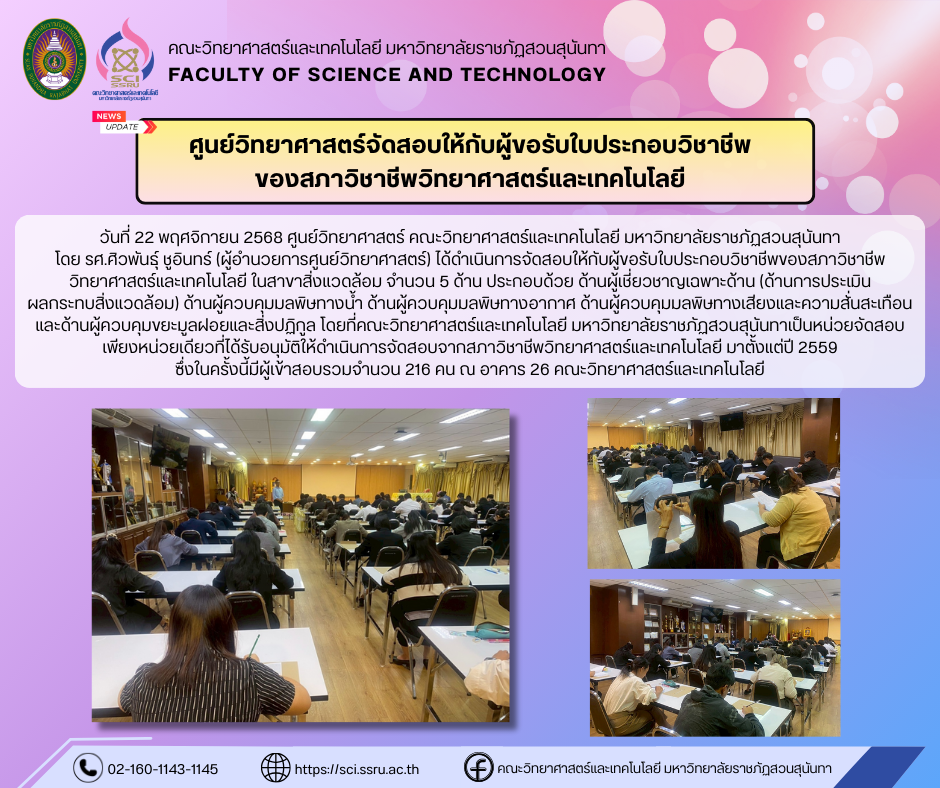 วันที่ 22 พฤศจิกายน 2568 ศูนย์วิทยาศาสตร์ คณะวิทยาศาสตร์และเทคโนโลยี มหาวิทยาลัยราชภัฏสวนสุนันทา โดย รศ.ศิวพันธุ์ ชูอินทร์ (ผู้อำนวยการศูนย์วิทยาศาสตร์) ได้ดำเนินการจัดสอบให้กับผู้ขอรับใบประกอบวิชาชีพของสภาวิชาชีพวิทยาศาสตร์และเทคโนโลยี ในสาขาสิ่งแวดล้อม จำนวน 5 ด้าน ประกอบด้วย ด้านผู้เชี่ยวชาญเฉพาะด้าน (ด้านการประเมินผลกระทบสิ่งแวดล้อม) ด้านผู้ควบคุมมลพิษทางน้ำ ด้านผู้ควบคุมมลพิษทางอากาศ ด้านผู้ควบคุมมลพิษทางเสียงและความสั่นสะเทือน และด้านผู้ควบคุมขยะมูลฝอยและสิ่งปฏิกูล โดยที่คณะวิทยาศาสตร์และเทคโนโลยี มหาวิทยาลัยราชภัฏสวนสุนันทาเป็นหน่วยจัดสอเพียงหน่วยเดียว ที่ได้รับอนุมัติให้ดำเนินการจัดสอบจากสภาวิชาชีพวิทยาศาสตร์และเทคโนโลยี มาตั้งแต่ปี 2559 ซึ่งในครั้งนี้มีผู้เข้าสอบรวมจำนวน 216 คน ณ อาคาร 26 คณะวิทยาศาสตร์และเทคโนโลยี