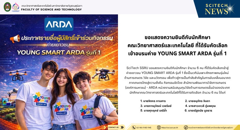 > ขอแสดงความยินดีกับนักศึกษา คณะวิทยาศาสตร์และเทคโนโลยี ที่ได้รับคัดเลือกเข้าอบรมค่าย YOUNG SMART ARDA รุ่นที่ 1