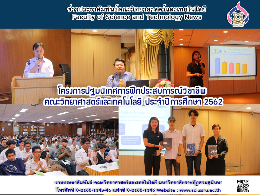 เมื่อวันที่ 21 เมษายน 2562 ฝ่ายบริการการศึกษา คณะวิทยาศาสตร์และเทคโนโลยี จัดโครงการปฐมนิเทศการฝึกประสบการณ์วิชาชีพ ณ ห้องประชุม 26103 ชั้น 1 อาคารคณะวิทยาศาสตร์และเทคโนโลยี ทั้งนี้เพื่อเป็นการเตรียมความพร้อมของนักศึกษาก่อนการฝึกประสบการณ์ เพื่อพัฒนาบุคลิกภาพ รวมถึงการมีเจตคติที่ดี ในการปรับตัวเพื่อพร้อมรับการฝึกประสบการณ์วิชาชีพในลำดับต่อไป