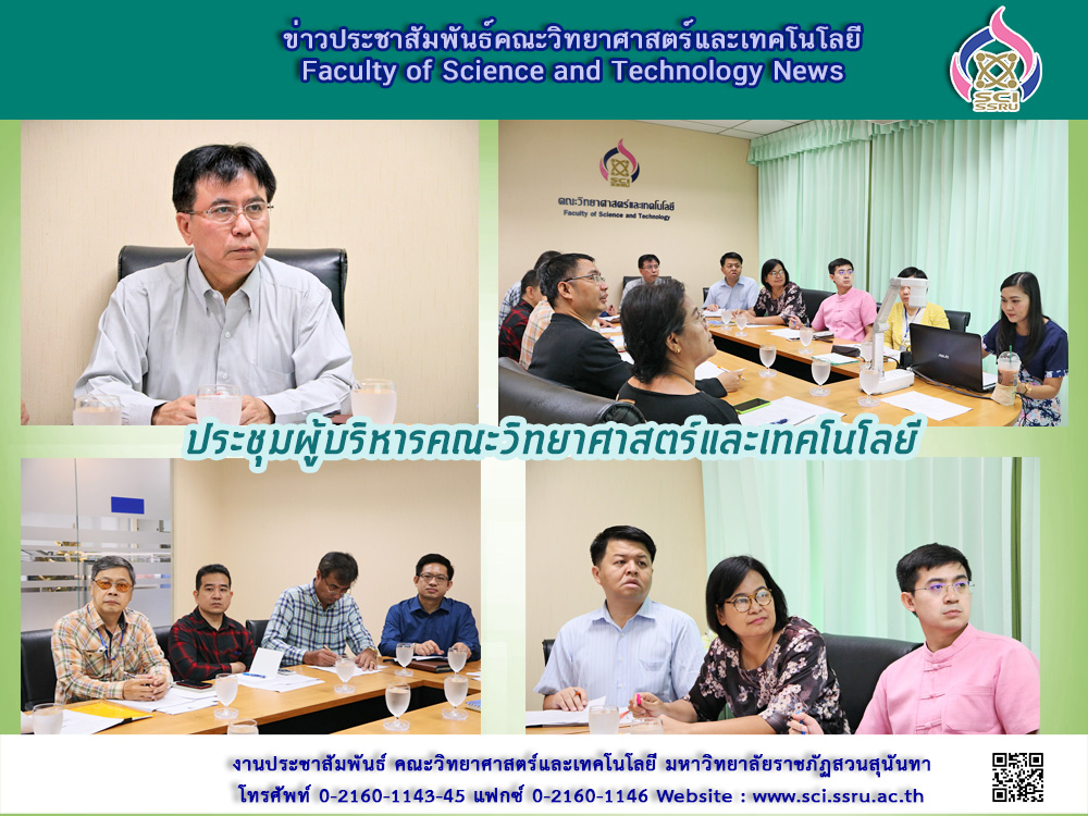 วันที่ 22 พฤศจิกายน 2561 โดย ผู้ช่วยศาสตราจารย์ ดร.อาณัติ ต๊ะปินตา คณบดีคณะวิทยาศาสตร์และเทคโนโลยี เป็นประธานในการประชุมผู้บริหารคณะ ซึ่งประกอบด้วย รองคณบดี ผู้ช่วยคณบดี หัวหน้าภาควิชา และผู้อำนวยการศูนย์วิทยาศาสตร์ โดยมีหัวข้อการประชุม ดังนี้ โครงการจัดอบรมหลักจริยธรรมการวิจัยในมนุษย์ ประจำปีงบประมาณ พ.ศ.2562, โครงการจัดอบรมเชิงปฏิบัติการเรื่องการเขียนหนังสือราชการและระเบียบการจัดซื้อจัดจ้าง ประจำปีงบประมาณ พ.ศ.2562, โครงการจัดประชุมวิชาการสำหรับนักศึกษาคณะวิทยาศาสตร์ฯ ครั้งที่ 2, โครงการความร่วมมือด้านการวิจัยกับการไฟฟ้าฝ่ายผลิตแห่งประเทศไทย, ความก้าวหน้าในการปรับปรุงหลักสูตร ปีการศึกษา 2562, โครงการนำเสนอผลงานทางวิชาการระดับนานาชาติ การรับสมัครผู้ขอรับทุนการศึกษาของนักศึกษาคณะวิทยาศาสตร์ฯ (โครงการแลกเปลี่ยน/ฝึกประสบการณ์วิชาชีพในต่างประเทศ, โครงการฝึกอบรมภาคฤดูร้อน ณ มหาวิทยาลัย Hradec) การทำข้อตกลงความร่วมมือทางวิชาการในประเทศ ประจำปีงบประมาณ พ.ศ.2562, การปรับปรุงอาคารคณะวิทยาศาสตร์, โครงการส่งมอบครุภัณฑ์การศึกษาและเสื้อผ้ากันหนาวแก่โรงเรียนด้อยโอกาสทางการศึกษา และ การรายงานรายรับ รายจ่าย บัญชีเงินรายได้ของคณะ
