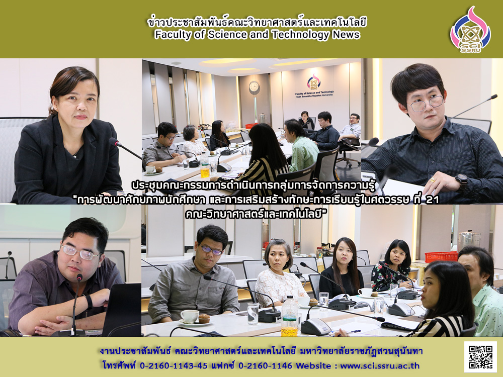 เมื่อวันพุธ ที่ 19 กุมภาพันธ์ 2563 ณ ห้องประชุม 26109 คณะวิทยาศาสตร์และเทคโนโลยี ผู้ช่วยศาสตราจารย์ ดร.ปิยะดา อาชายุทธการ รองคณบดีฝ่ายวิชาการ เป็นประธานในการประชุมคณะกรรมการดำเนินการกลุ่มการจัดการความรู้ : การพัฒนาศักยภาพนักศึกษา และการเสริมสร้างทักษะการเรียนรู้ในศตวรรษ ที่ 21 คณะวิทยาศาสตร์และเทคโนโลยี โดยการประชุมมีเรื่องเสนอเพื่อทราบ ดังนี้ แผนการจัดการความรู้ของบุคลากรสายวิชาการประจำปีงบประมาณ พ.ศ.2563 คำสั่งแต่งตั้งคณะกรรมการจัดการเรียนรู้ คณะวิทยาศาสตร์และเทคโนโลยี ประจำปีงบประมาณ พ.ศ.2563 รายงานข้อมูลแบบสอบถามสำหรับนักศึกษา เรื่อง “การพัฒนาทักษะภาษาอังกฤษในชีวิตประจำวัน” และเรื่องเสนอเพื่อพิจารณา แนวทางการพัฒนาทักษะภาษาอังกฤษในชีวิตประจำวันสำหรับนักศึกษา และ การพิจารณาเลือกสถานประกอบการเพื่อแลกเปลี่ยนความคิดเห็นแนวทางการพัฒนาทักษะภาษาอังกฤษของนักศึกษา