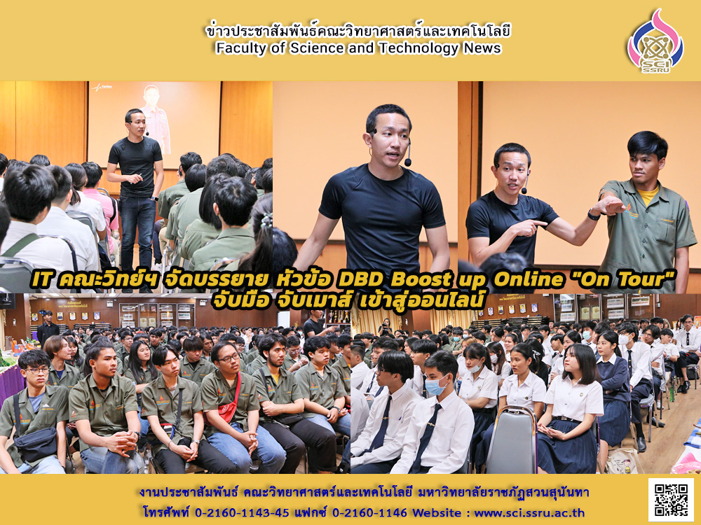วันจันทร์ ที่ 24 กุมภาพันธ์ 2563 ณ ห้อง 26103 สาขาวิชาเทคโนโลยีสารสนเทศ คณะวิทยาศาสตร์และเทคโนโลยี มหาวิทยาลัยราชภัฏสวนสุนันทา จัดกิจกรรมบรรยายในหัวข้อ DBD Boost up Online "On Tour" จับมือ จับเมาส์ เข้าสู่ออนไลน์ โอกาสของการเรียนรู้โลกออนไลน์ที่ใกล้ตัวคุณที่สุด โดยวิทยากร ผู้กองเบนซ์ ร.ต.อ. สี่ทิศ อ่ำถนอม ผู้เชี่ยวชาญด้านการทำ Personal Branding Facebook Live และ Facebook Marketing เจ้าของแฟนเพจ "ผู้กองเบนซ์ - Capt.Benz" กระบี่มือหนึ่งในการสร้าง content ให้น่าสนใจ