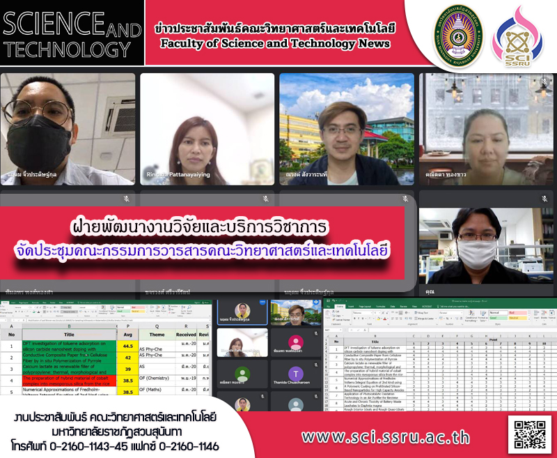 วันจันทร์ที่ 22 กุมภาพันธ์ 2565 ฝ่ายพัฒนางานวิจัยและบริการวิชาการ จัดประชุมคณะกรรมการวารสารคณะวิทยาศาสตร์และเทคโนโลยี มหาวิทยาลัยราชภัฏสวนสุนันทา (ย่อย) เพื่อเตรียมความพร้อมรับการประเมินคุณภาพวารสารวิชาการคณะวิทยาศาสตร์และเทคโนโลยี The Suan Sunandha Science and Technology Journal (SSSTJ) จาก ศูนย์ดัชนีการอ้างอิงวารสารไทย (TCI) ประจำปี 2565