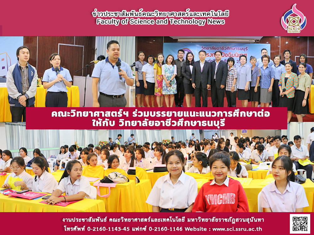 เมื่อวันศุกร์ ที่ 21 กุมภาพันธ์ 2563 ที่ผ่านมา ผู้ช่วยศาสตราจารย์ ดร.ปิยะดา อาชายุทธการ  รองคณบดีฝ่ายวิชาการ พร้อมด้วย อาจารย์ดุสิต บุหลัน ตัวแทนคณาจารย์สาขาวิชาคหกรรมศาสตร์ และ เจ้าหน้าที่ฝ่ายบริการการศึกษา คณะวิทยาศาสตร์และเทคโนโลยี มหาวิทยาลัยราชภัฏสวนสุนันทา ได้เข้าร่วมบรรยายการแนะแนวการศึกษาต่อ ในโครงการปัจฉิมนิเทศนักเรียนนักศึกษา ณ ห้องประชุมพระยาอนุบาลดิตถกรรม วิทยาลัยอาชีวศึกษาธนบุรี ทั้งนี้ เพื่อประชาสัมพันธ์คณะวิทยาศาสตร์ฯ แนะแนวการศึกษาต่อและสร้างทางเลือกให้กับนักเรียนนักศึกษา